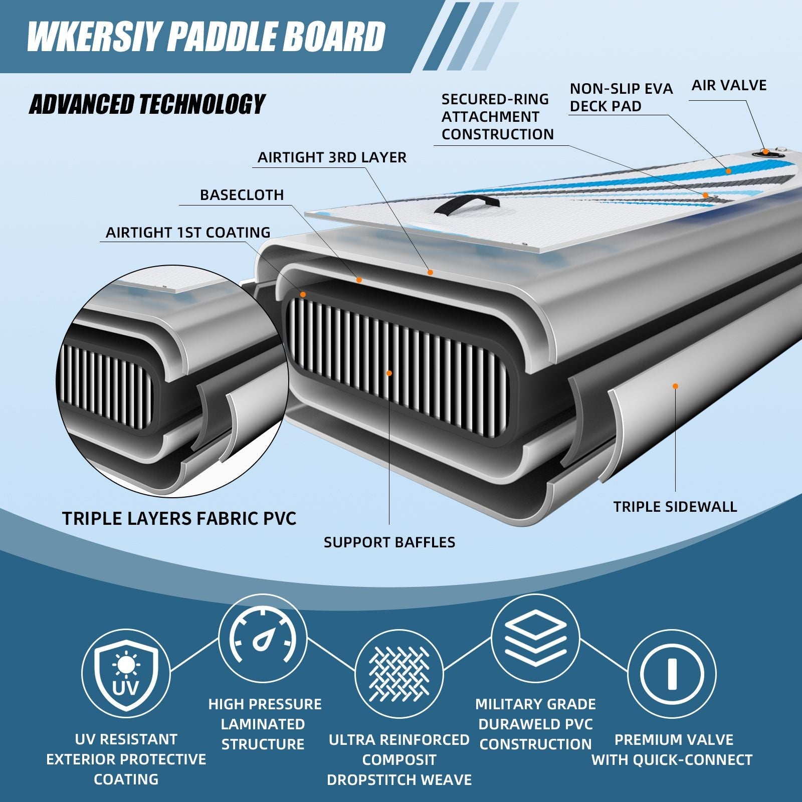[ ]- Air in some blow-up inflatable paddle boards may leak from weak seams where the glue comes apart. But wkersiy paddle board is made of military-grade drop-stitch fabric for the inner layer, boat PVC for protecting layer.