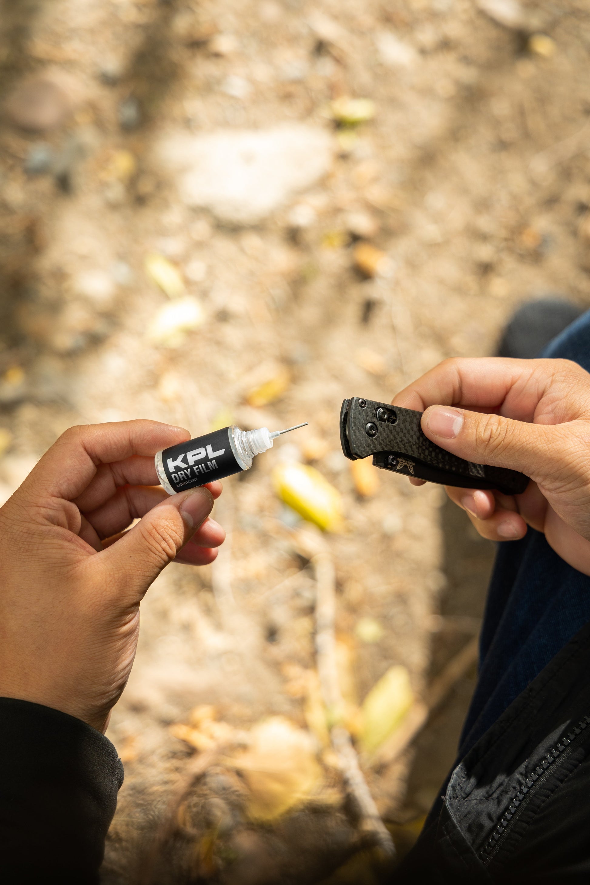 For those that prefer to run their pivots dry to avoid attracting dust and dirt, we introduce KPL Dry Film™. DRY FILM™ goes on as a liquid, but quickly flashes off to leave behind a 100% dry fluorinated layer. Unlike competing products, Dry Film has no liquid or waxy components to attract dust or lint. In fact, the low surface energy of dry film prevents particulates from attaching themselves to metal surfaces and makes them less likely to attract themselves to your knife parts.