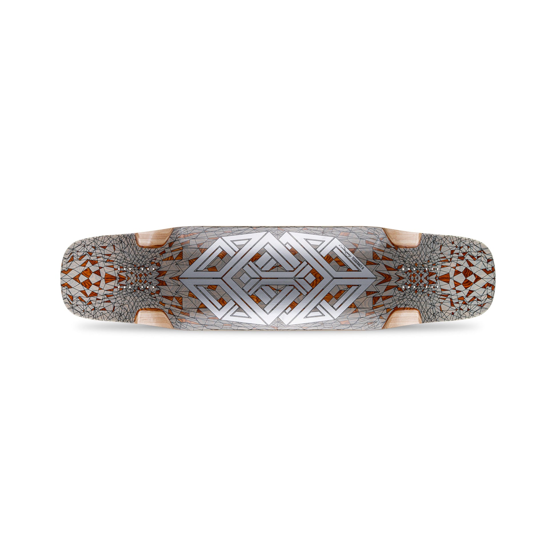 The Tesseract II is your portal to high-performance freestyle and freeride. Its micro-drop platform locks you in for an immersive connection, while symmetrical double kicks defy gravity, opening up a universe of possibilities. Built with six plies of long-grain maple and tri-axial fiberglass, it's engineered for perfect stellar stiffness and explosive pop. Laser-cut 50-grit griptape and machined wheel wells keep you grounded, while the photochromic graphic hints at new dimensions in your skateboard progression.