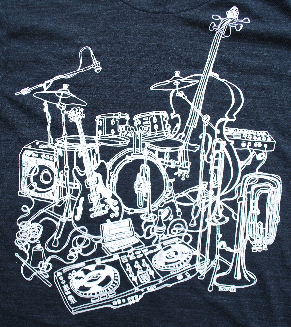 White water based discharge silk screen ink on 50/50 poly cotton blend. Enjoy everything you love about the fit, feel and durability of a vintage T-shirt, in a brand new version. This design is from an original drawing that I did of a stage setup for a band.