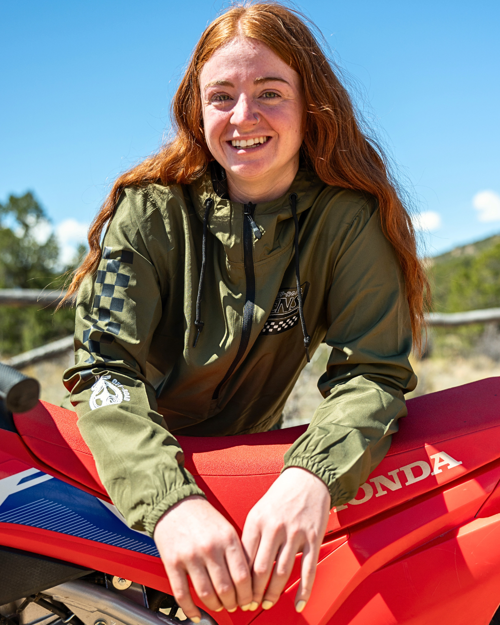 Experience the freedom of the open road with our Off the Wall Pullover Windbreaker! Designed for on and off-road adventures. This jacket features one of our most popular designs and as a bonus it is packable. Stay cool during summer rides and keep the wind at bay on cooler days. It's the perfect companion for any adventure seeker! You won't be able to resist this Military Green and Black color combo.