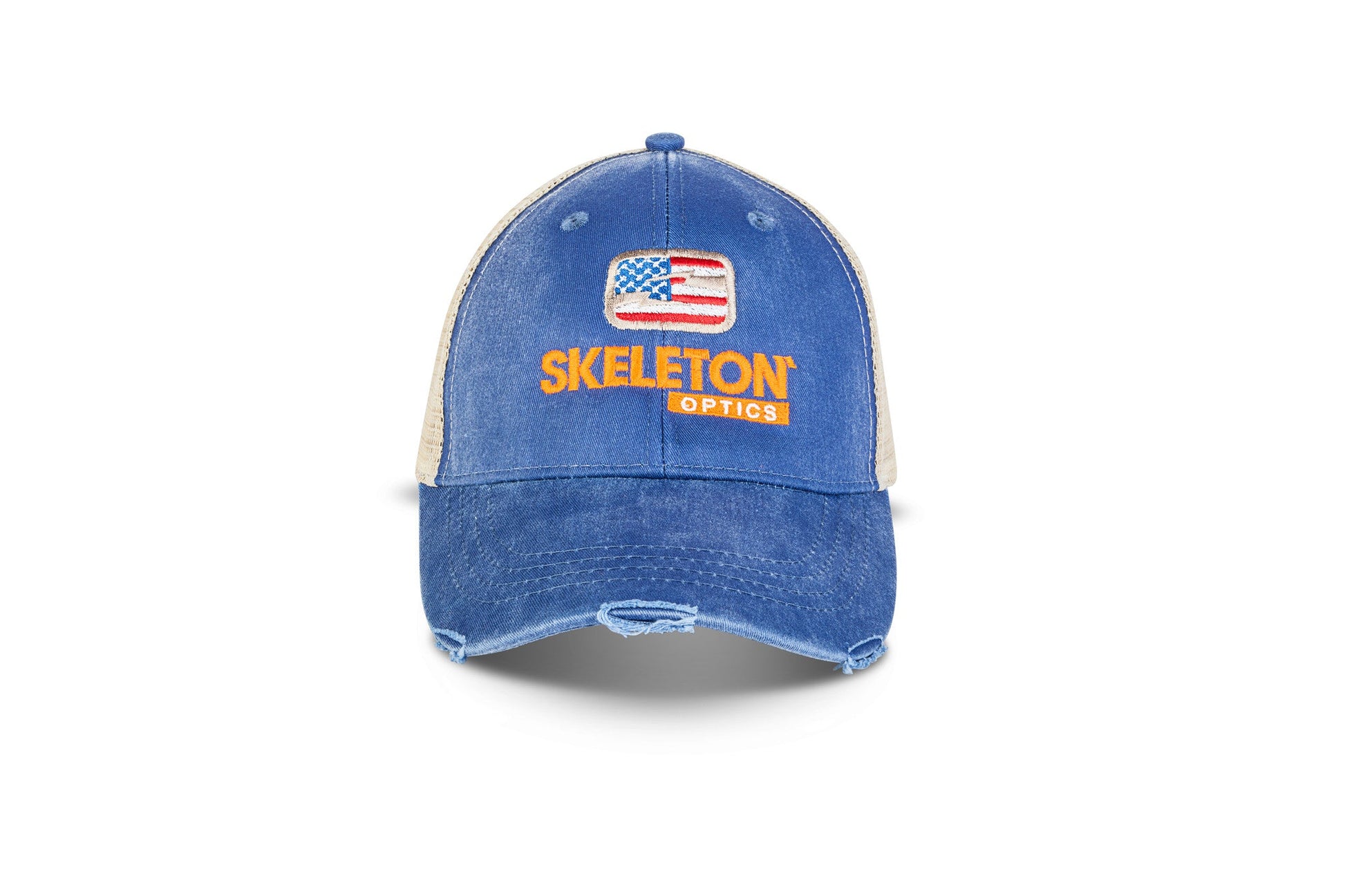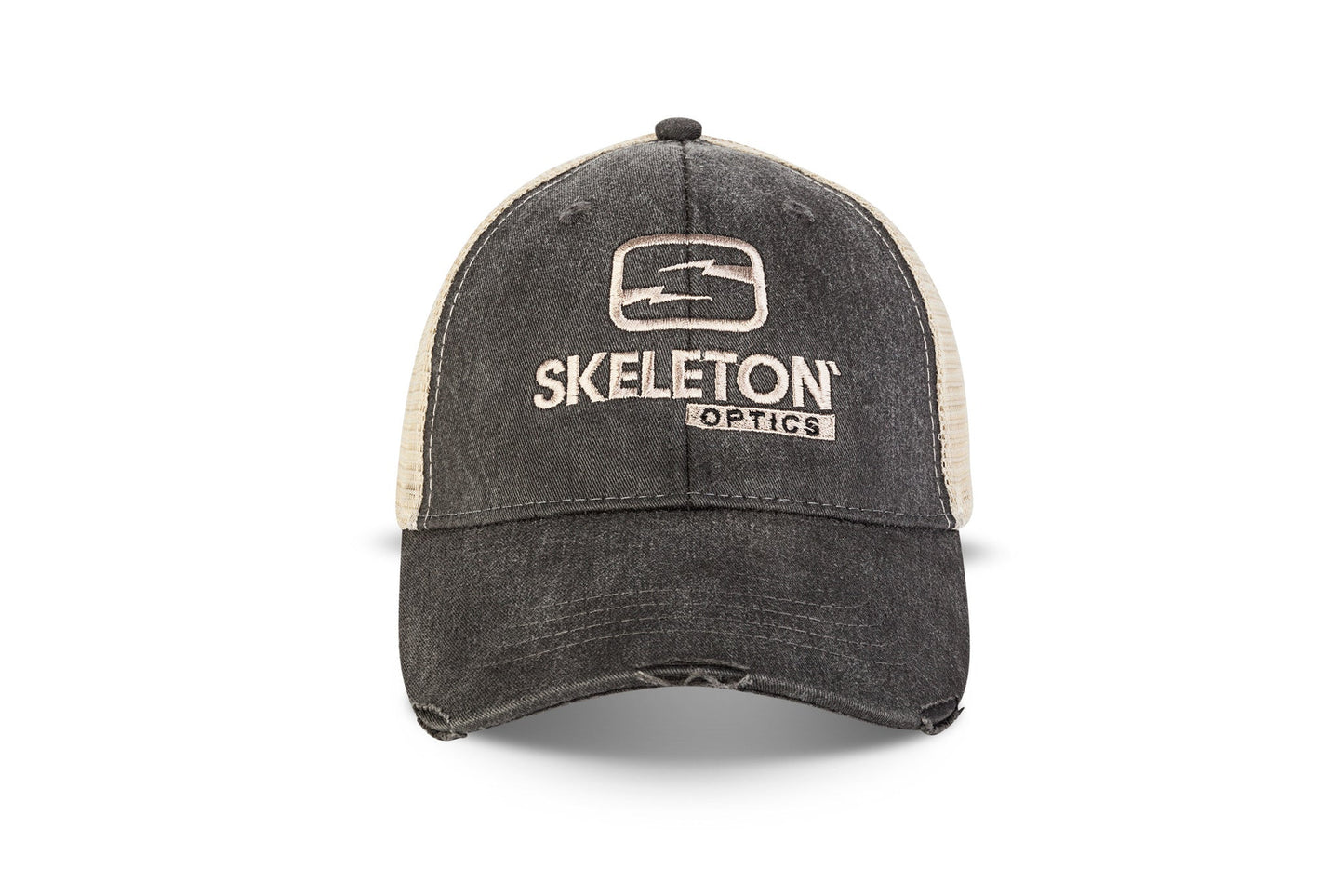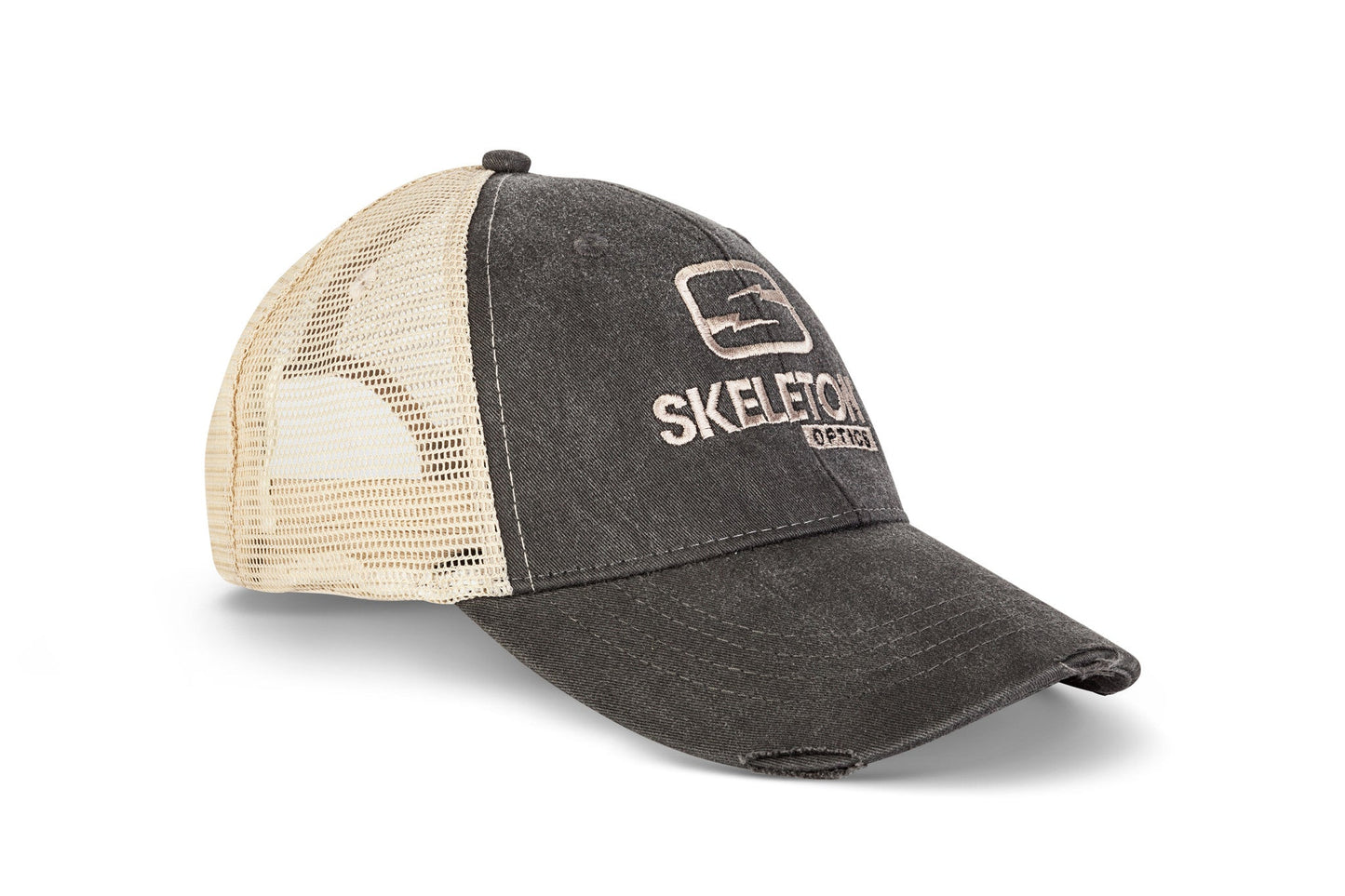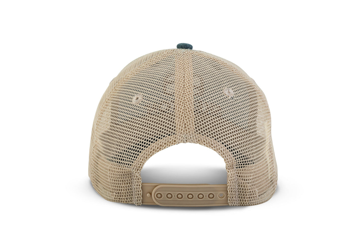 Made of 100% cotton, garment-washed and pigment-dyed on front two panels and visor, 100% nylon mesh on tan back panels, structured, mid-profile, 6-panel, updated trucker style, distressed torn visor, cotton twill sweatband and matching plastic back tab closure.