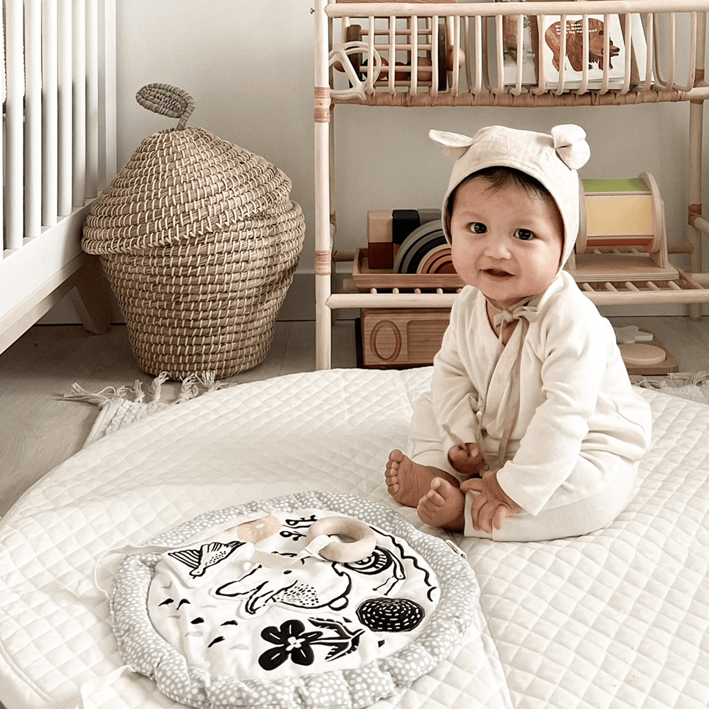 The Meadow Activity Pad keeps your baby entertained with a variety of sensory stimulation from high contrast graphics, and hidden items including crinkly features, a rattle, a squeak and a maple wood teething ring hidden behind the Bunny in a pocket.
