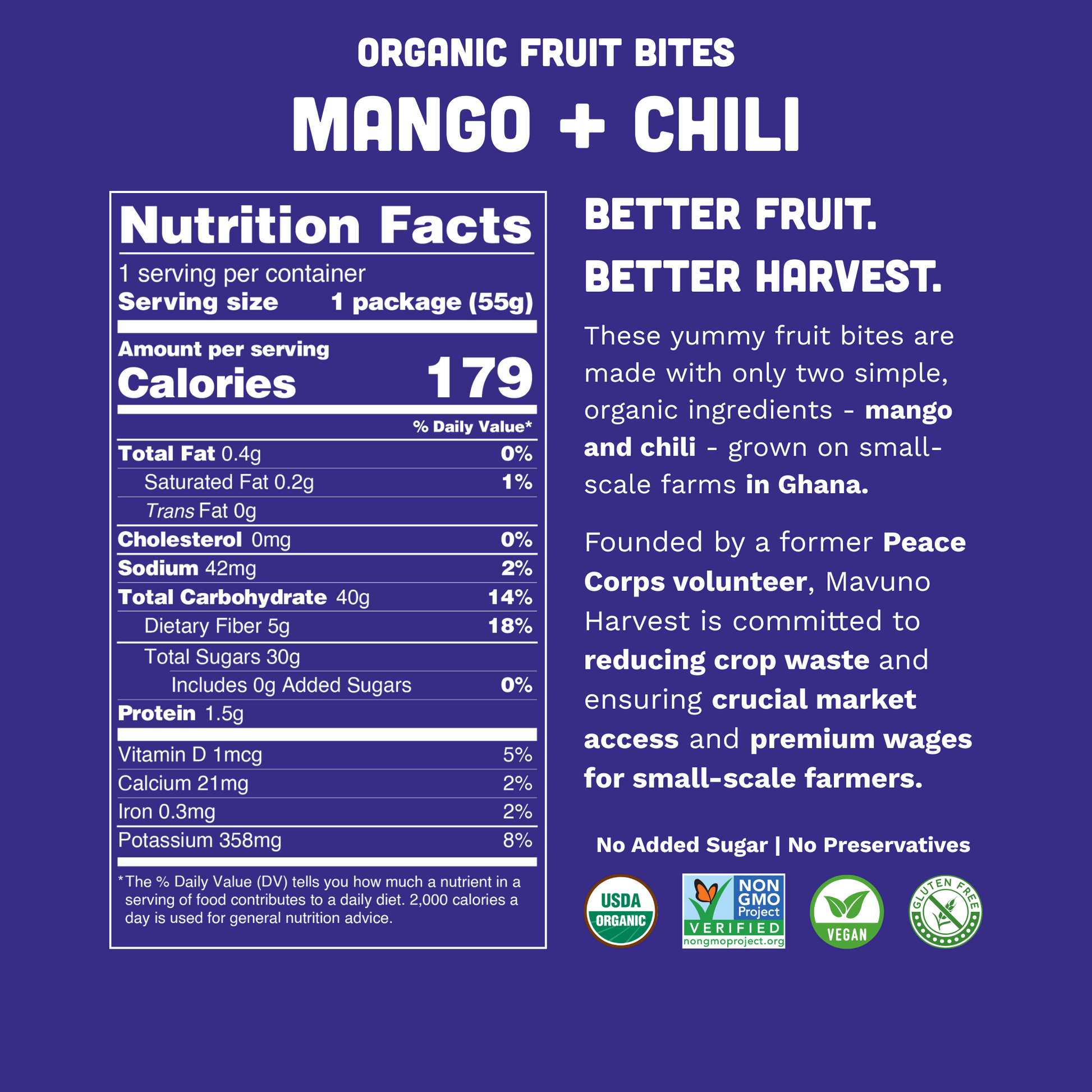 Our mangoes are grown in Ghana by smallholder farmers, then paired with chili for a snack that’s adventurous, simple, and sustainable.