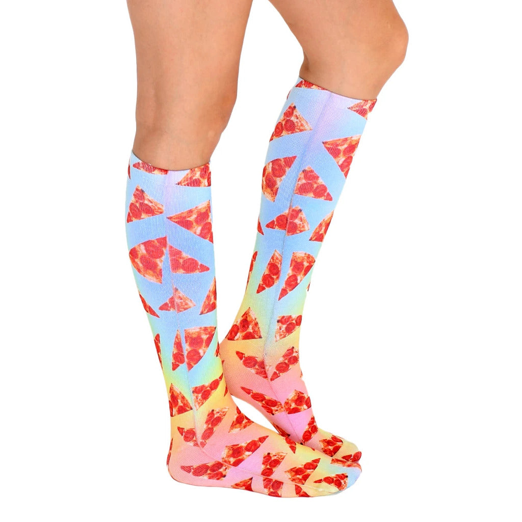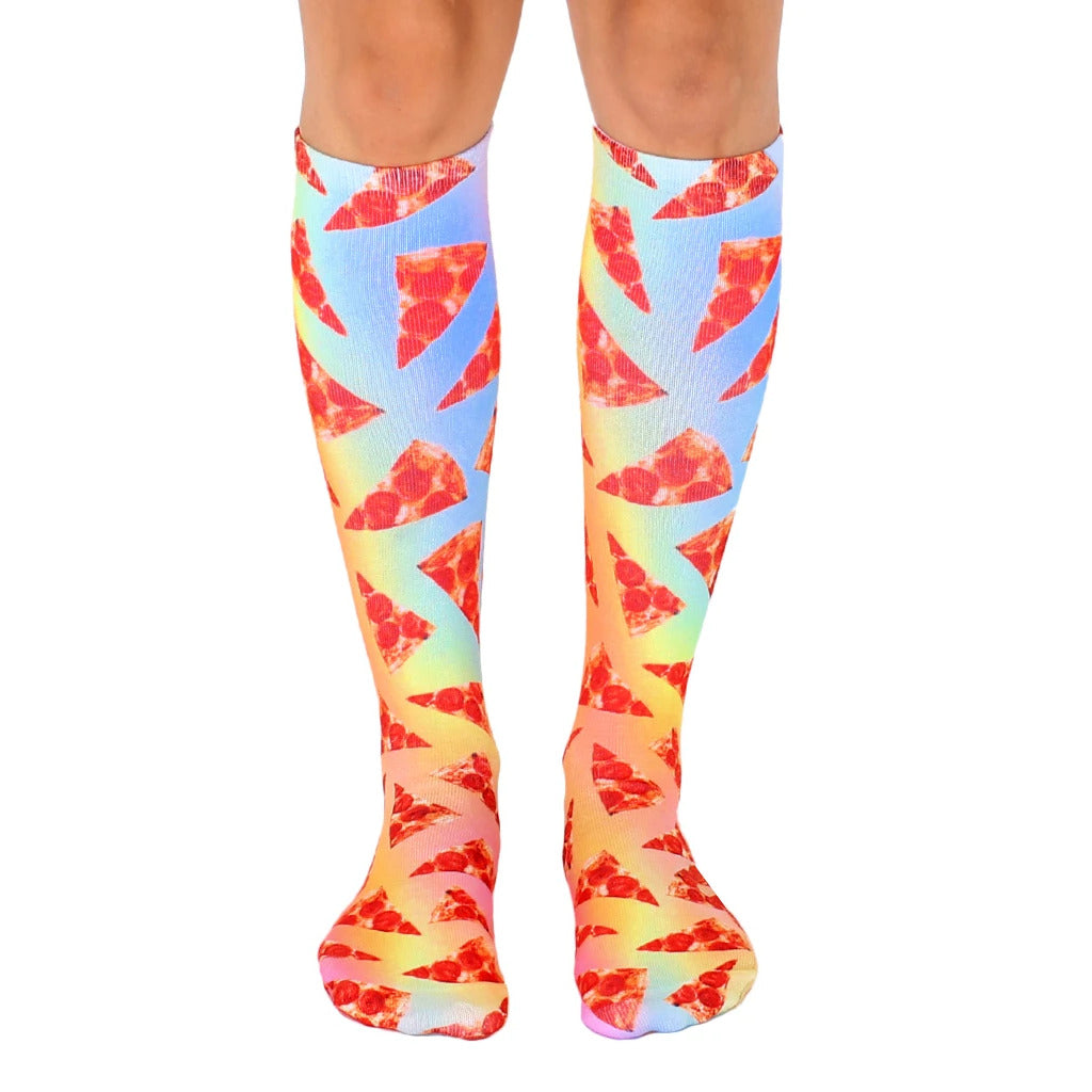Pizza Slices Knee High Socks: These eye-catching socks are sure to make you the center of attention at your next pizza party. With their vibrant blue, yellow, and pink background and delectable pepperoni pizza slice pattern, you'll be the talk of the town. Plus, the unisex design means everyone can get a slice of the fun! Strut your stuff in these pizza-licious socks that are sure to be a hit with pizza lovers of all ages!