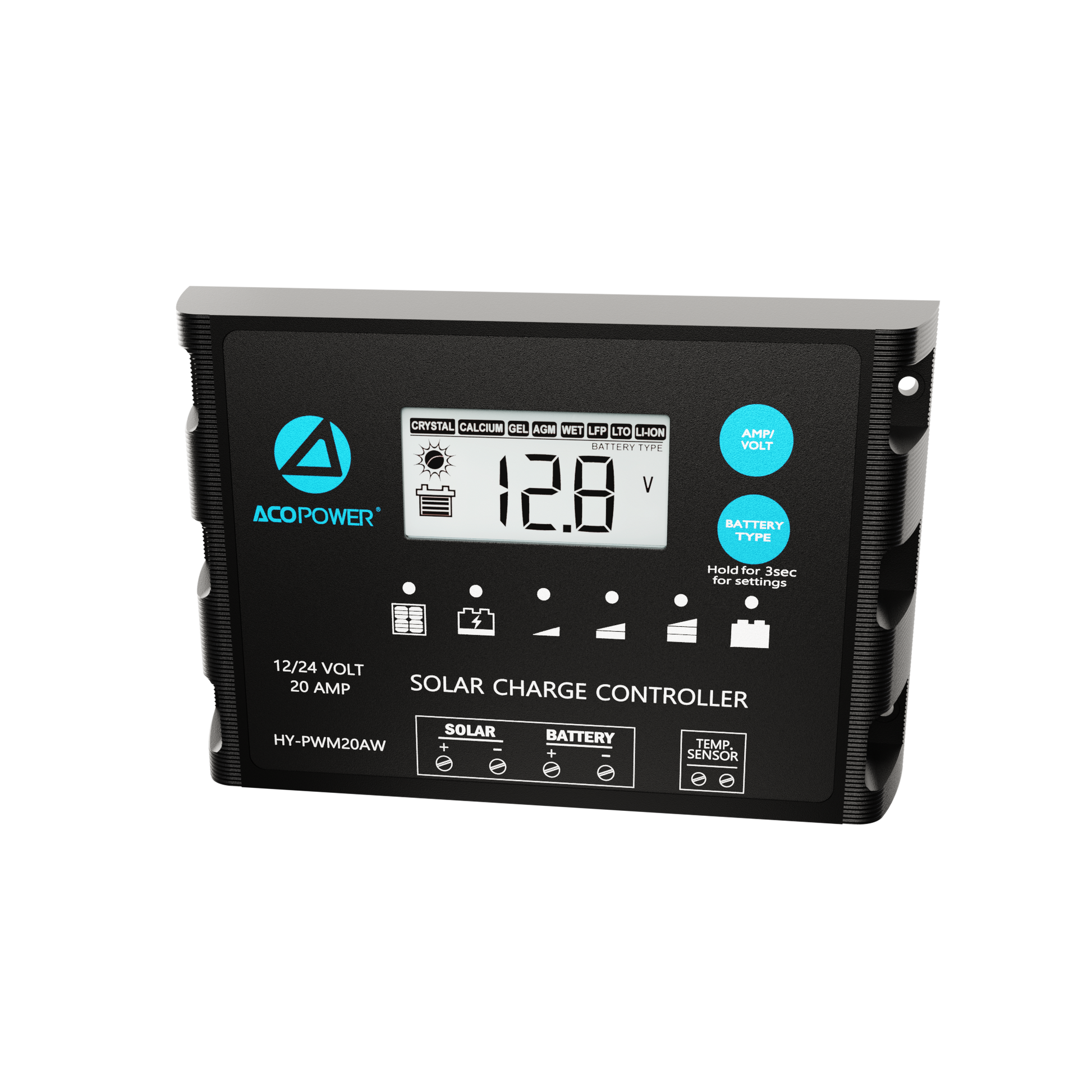 Featuring a bright blue back-lit LCD display system, including error codes. Designed and engineered to world-class quality standards. Not only is it waterproof, but it is also equipped with advanced PWM technology suitable for 12V and 24V off-grid applications, and compatible with 8 different battery types, including Lithium.