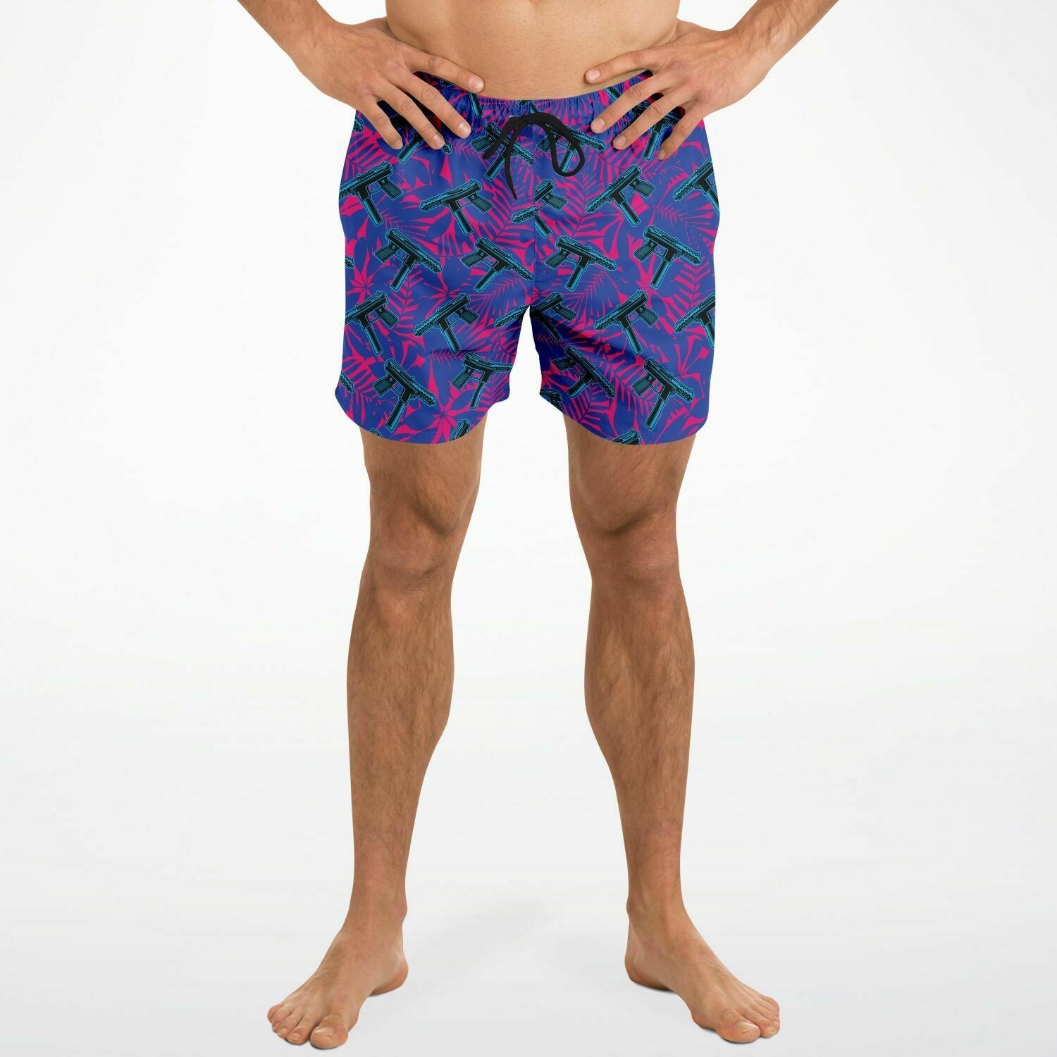 Look and stay cool with these shorter-length swim trunks that hit above the knee. They come in a fast-dry fabric, and feature a drawstring waistband, mesh basket lining and mesh-lined side pockets.