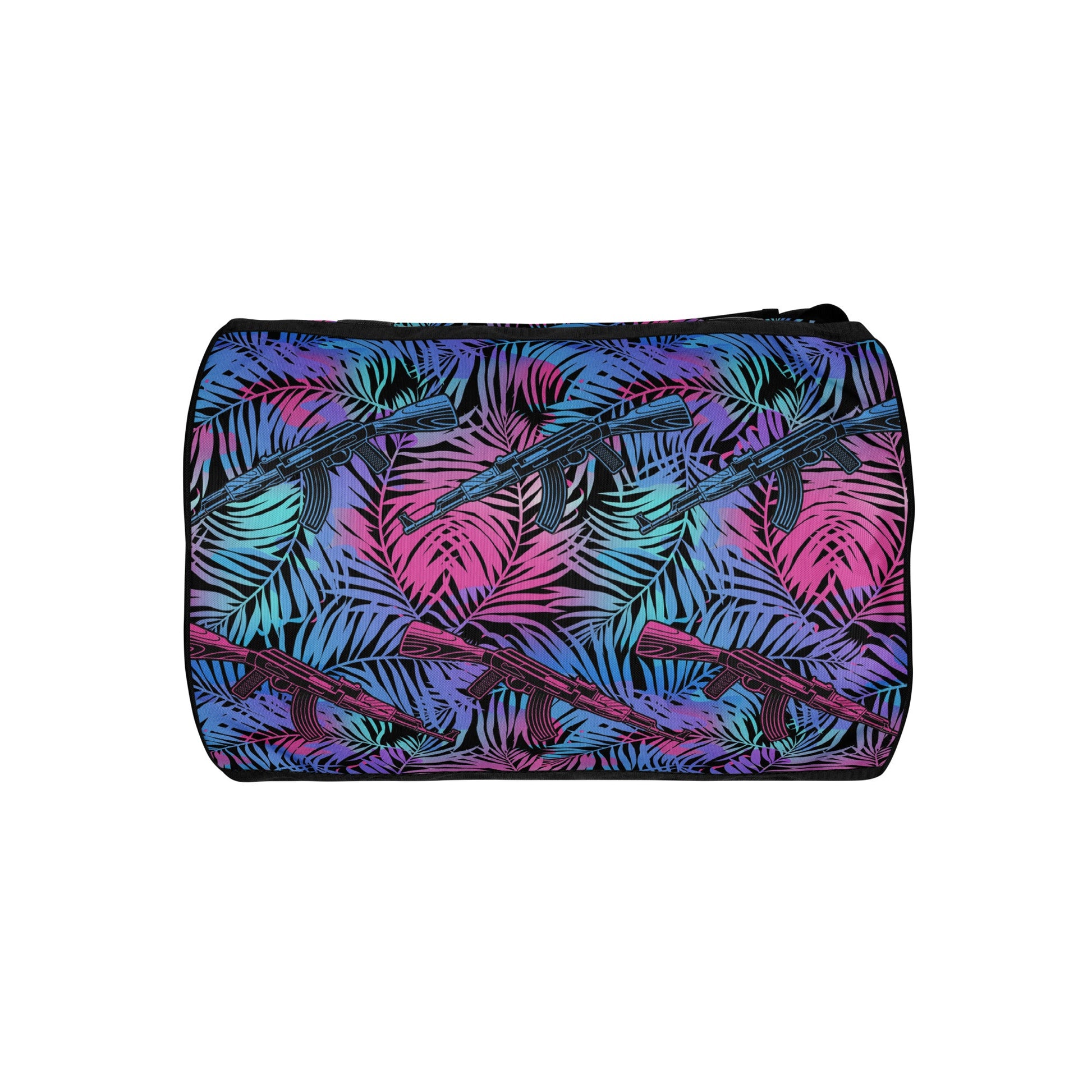 Ready to get your fitness on? Add some punch to pumping iron with this all-over print gym bag. Made from 100% polyester and sturdy, water-resistant fabric, this bag is fun meets function. And it’s got pockets!