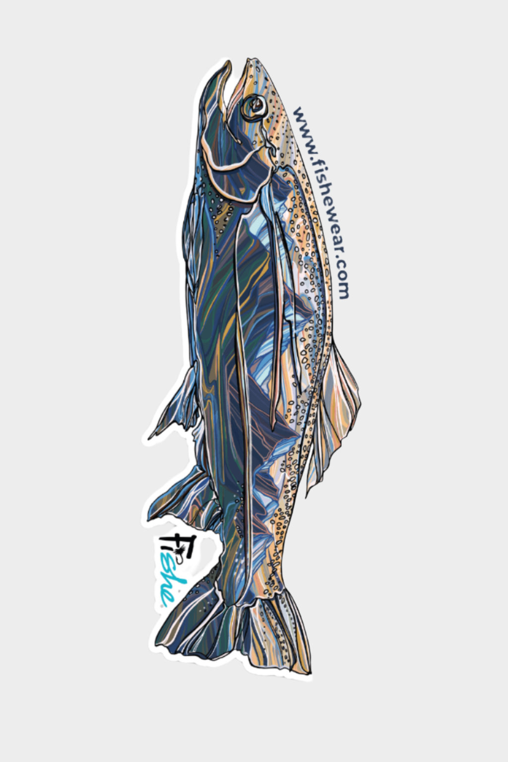 Featuring the signature Rainbow Ridge pattern — a celebration of colorful ridgelines and wild fish energy — this sticker is a mini piece of wearable art, made to stick with you on every adventure.