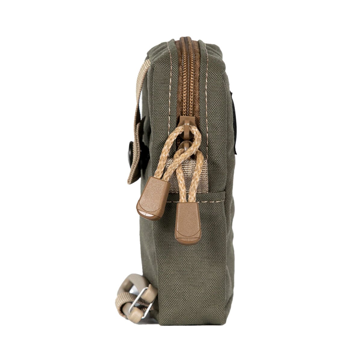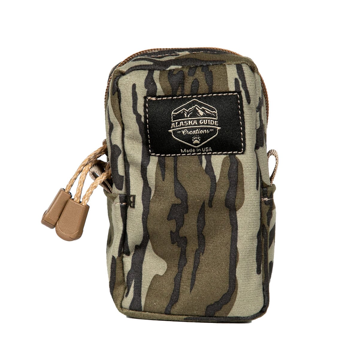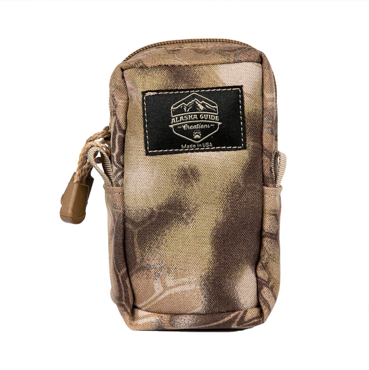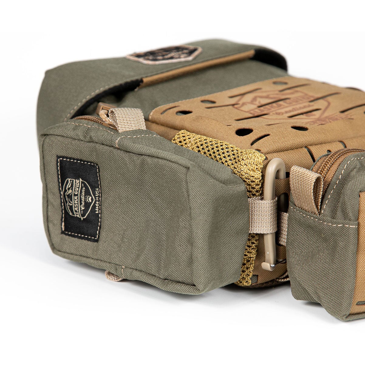 The Alaska Guide Creations Ravus Side Pocket is a stand alone zippered pocket that can be attached to any belt, bino harness, backpack, etc. However, it was designed to attach the side of the Ravus Bino Pack. The pocket features dual zippers that make it ideal for right and left handed users. It attaches to the side of the Ravus with one strap affixed with a snap closer and one gatekeeper.
