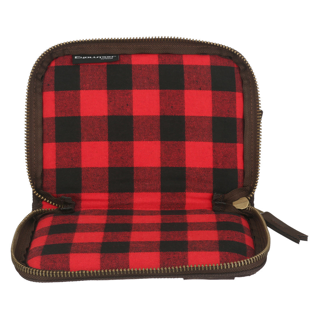 Featuring antique brass zippers and a leatherette logo patch, this case exudes a vintage charm that adds a touch of elegance to your hunting gear. On the inside, the plaid flannel lining does a fantastic job of protecting your firearm's finish, shielding it from bothersome scratches and ensuring it stays in top shape. Plus, with the heavy gauge interior foam padding, your pistol remains snug and secure, no matter how challenging the hunting trail gets.