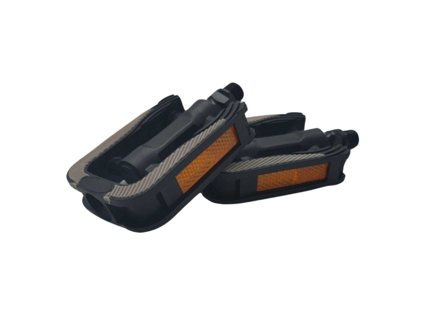 This pair of resin 9/16" pedals features orange safety reflector stripes on both sides of each pedal to increase visibility, and a non-slip rubber insert.