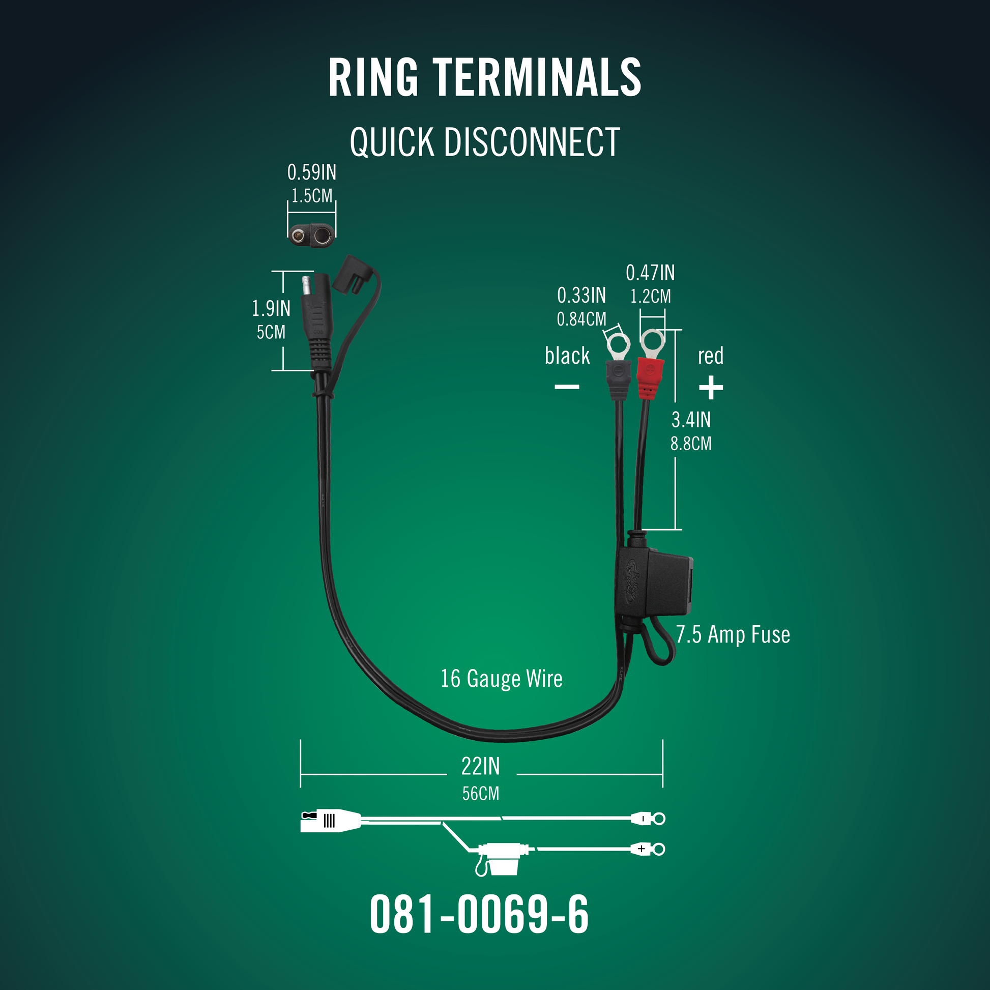Our 18-inch ring terminal accessory cables securely attach to any 12V, 8V, or 6V battery using their quick disconnect attachments. With a 7.5 AMP fuse for battery protection, charge your batteries easily and without worry. This product includes 25 accessory cables.
