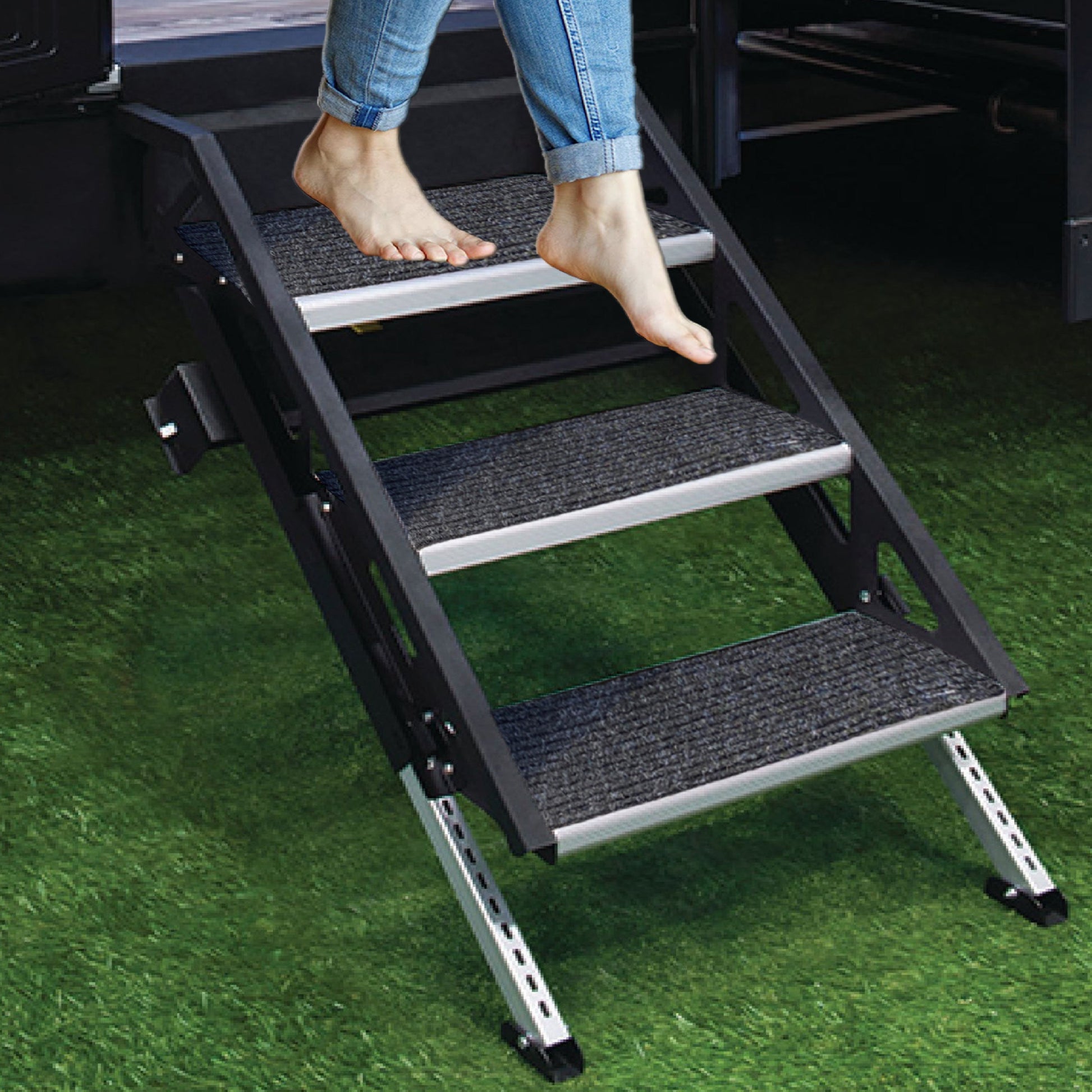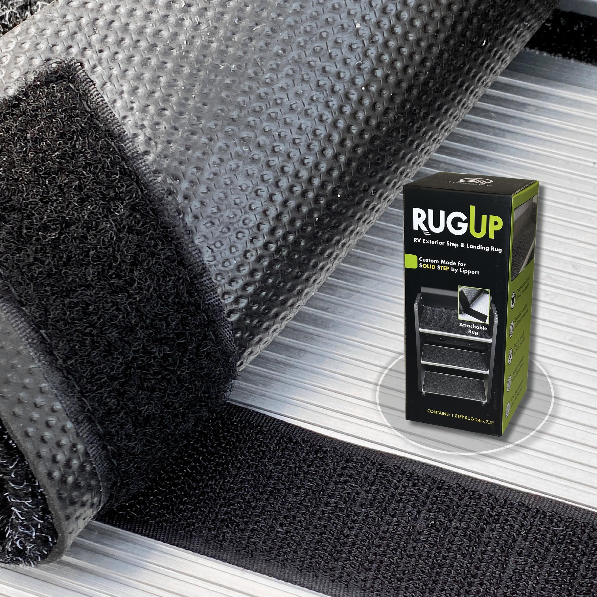 The rigid rug texture is designed to trap dirt while protecting the step from any scratches. Unlike other rugs, RUGUP is the only product that actually covers the entire step surface ensuring a safe step up and down for you and your pets from your RV.