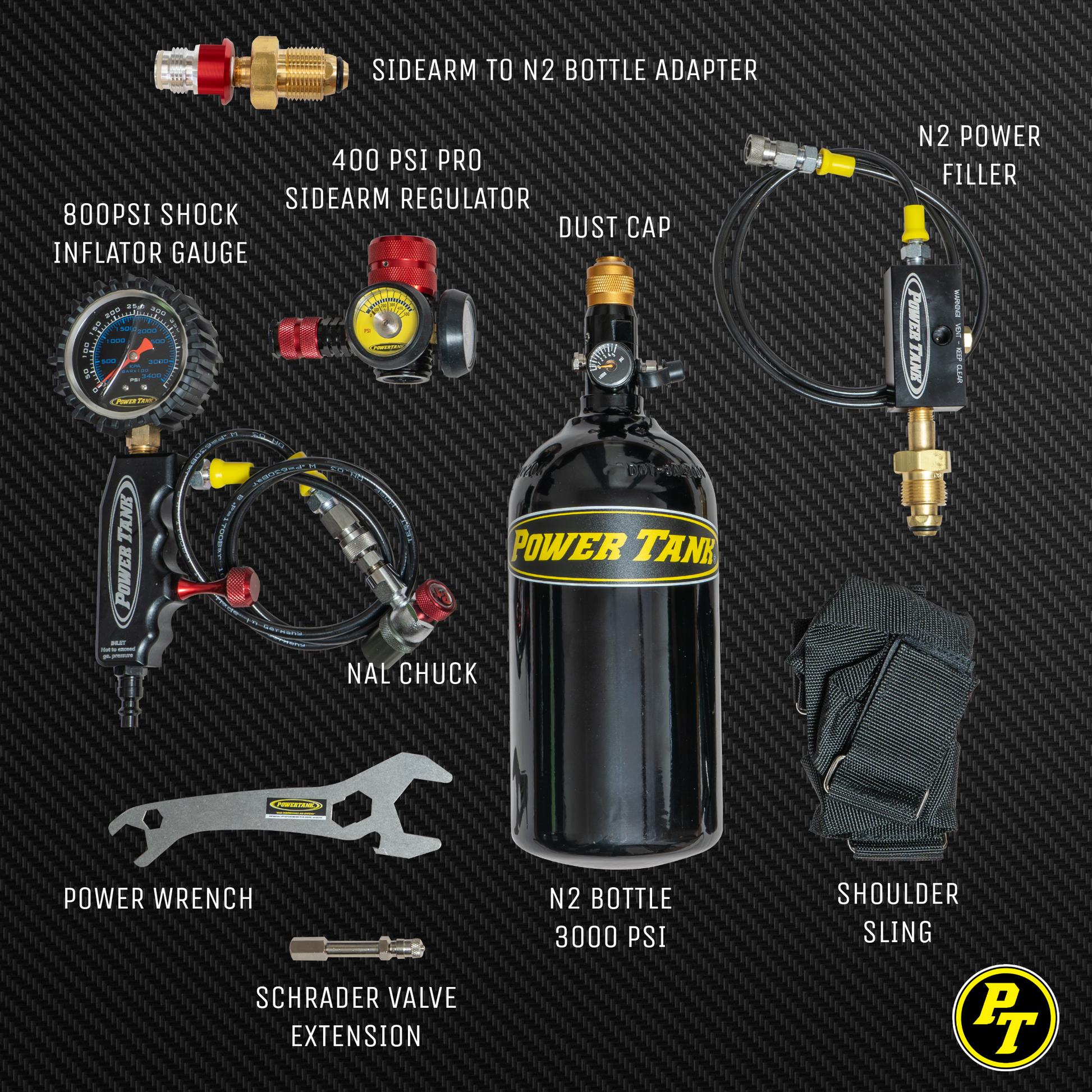 In order to use this kit, you will need to buy or rent a nitrogen cylinder with gas in order to fill the 72 ci bottle contained in this kit. From the rented cylinder, use the included N2 Power Filler to charge the 72 ci bottle. Attach the Sidearm PRO Series Regulator to the 72 ci bottle, attach the Shock Inflator to the Sidearm Regulator with a quick-release coupler, and attach the PT Shock Chuck™ to your Schrader valve on the shock or bump stop. The PT Shock Chuck™ can be operated by hand using knurled thumb nuts instead of a wrench required on other No-Air-Loss (NAL) Chucks.