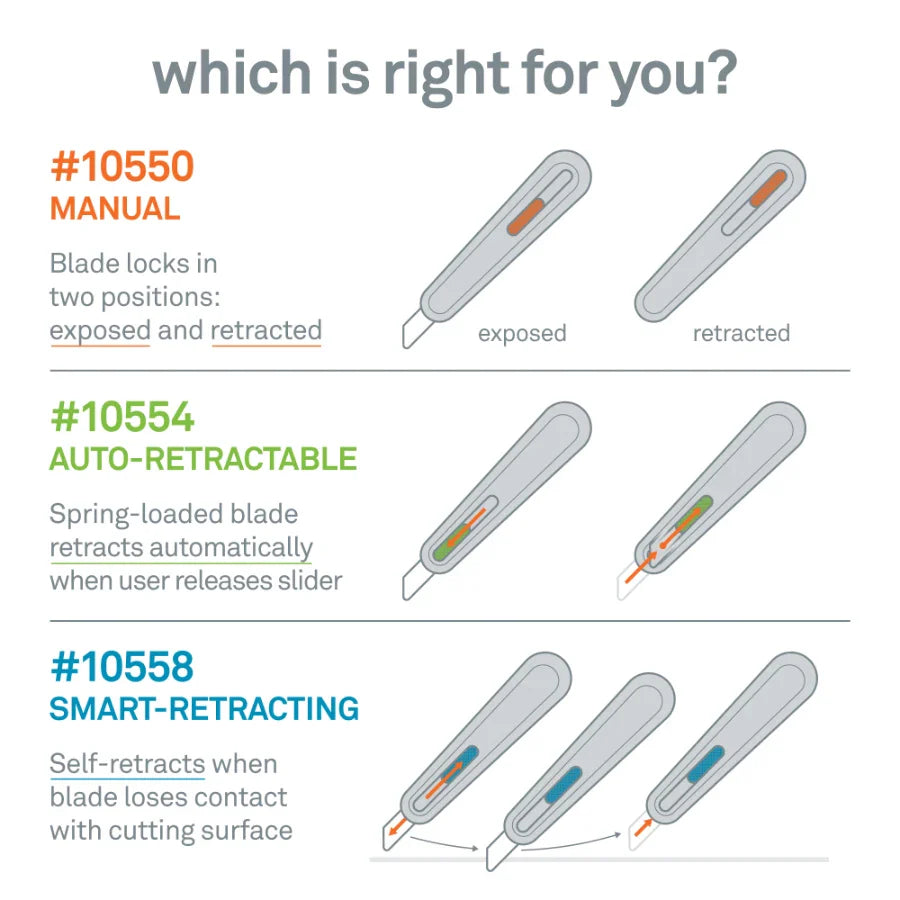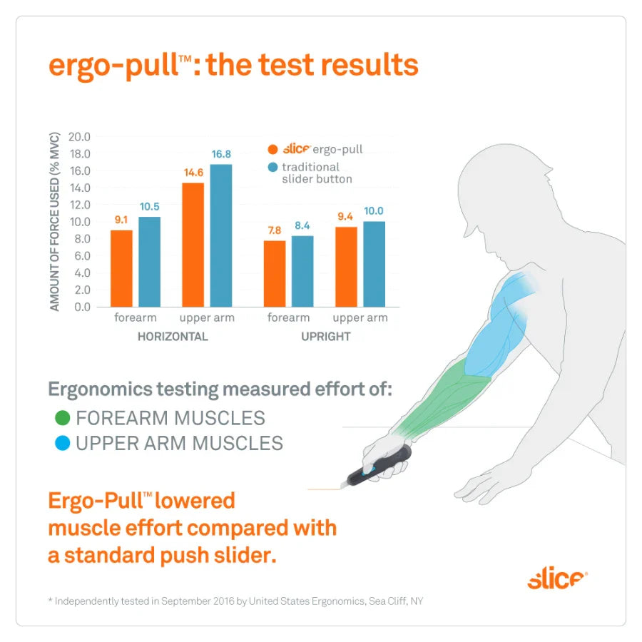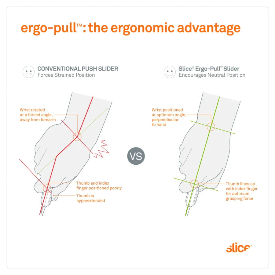 The Slice® Smart-Retracting Utility Knife combines safety and intelligence to reduce injuries and increase productivity. The tool’s blade is the safest you’ll find in the workplace. Its unique finger-friendly® blade is safe to the touch and therefore causes fewer and less severe injuries than traditional blades. To further protect your frontline workers, the blade instantly self-retracts when it loses contact with its cutting material. The Ergo Pull™ slider that extends the blade reduces hand strain because users slide this feature in the same direction as the cut. While a durable reinforced nylon handle provides strength and comfort, so the multi-purpose knife is ideal for industrial usage - especially as it has a longer blade for thicker cuts. This clever tool is suitable for left- and right-handed workers, and an integrated lanyard hole and tool-free blade-change mechanism help frontline workers operate more efficiently.