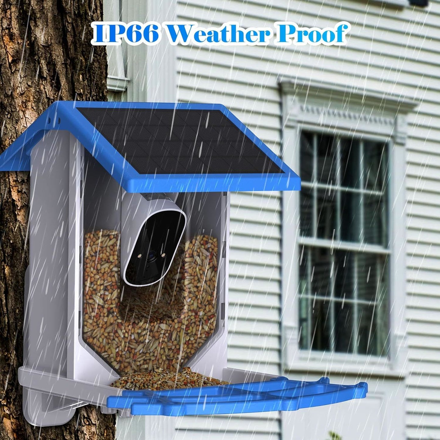 - [Friendly Design]- The birdhouse camera is professionally designed as a beautiful home for your backyard birds. IP66 weatherproof and firm stand make it a solid house for birds. With its built-in 5000mAh battery, solar panel design.The 2.5L large capacity container can store enough food for birds so you don't need to add bird food frequently. Don't worry about mold owning to the waterproof feature. These bird-friendly features will attract all kinds of birds.