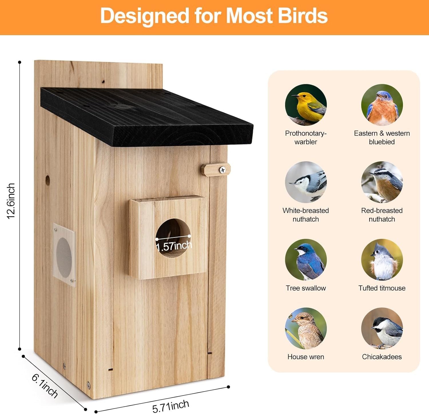 🐦[Friendly Design]The bird house has three customized holes that suit most bird species, apply a metal-guarded entrance deters predators. Bird parents can build a nest and feed the baby in a safe and comfortable home. The fledglings also can practice their climbing and flying skills by crawling through gaps on the inner side. It's also easy to open the 180° magnetic door to clean it.