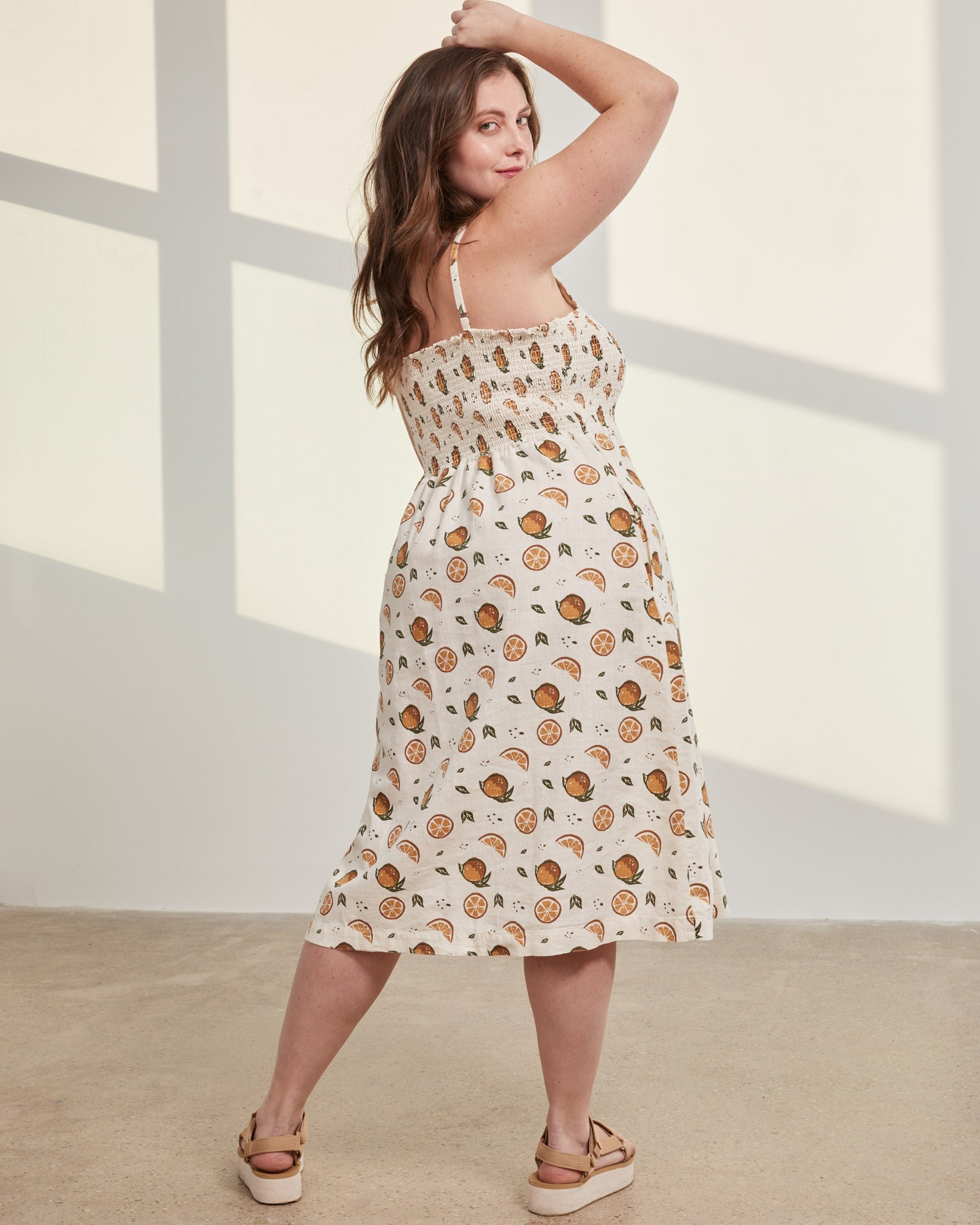 Welcome back, sundress season. This sweet, smocked midi dress has a snug bodice, a looser, A-line skirt, and a touch of ruffles at the top. Made with an all-natural blend of hemp and organic cotton that gets softer with every wear. Oh yeah, and it has pockets.