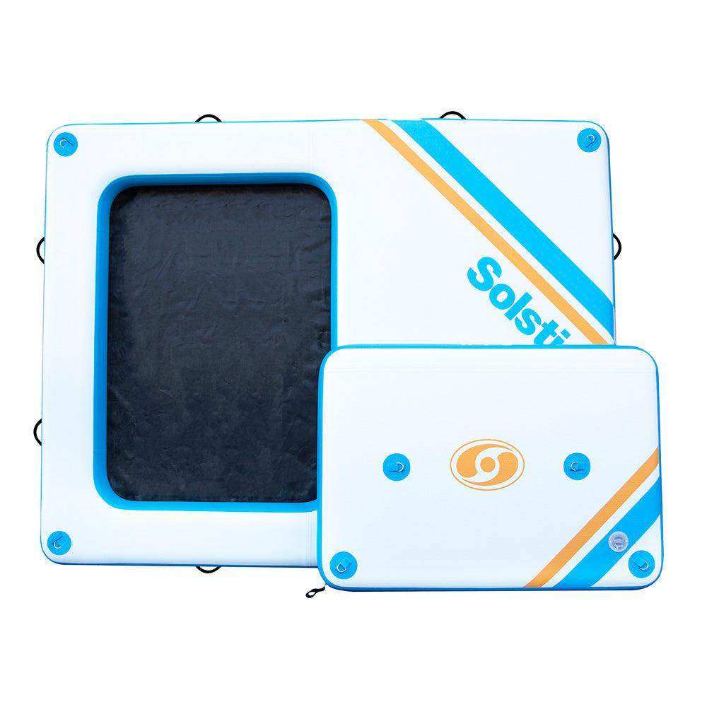 Inflatable 10' x 8' rectangular dock with removable inset dock offering a mesh hangout area. Utilize one side of the dock to lounge with chairs, coolers, and more while also enjoying the mesh in-water seating area. The mesh center is removable. 5' x 4' inset dock when removed can be tied up to create additional dock space holding coolers, watersports gear, and more. The dock is constructed with an 8" core providing additional buoyancy & stability. Fits up to 8 people with minimal tossing, turning, or tipping. Portable & compact when folded for easy storage.