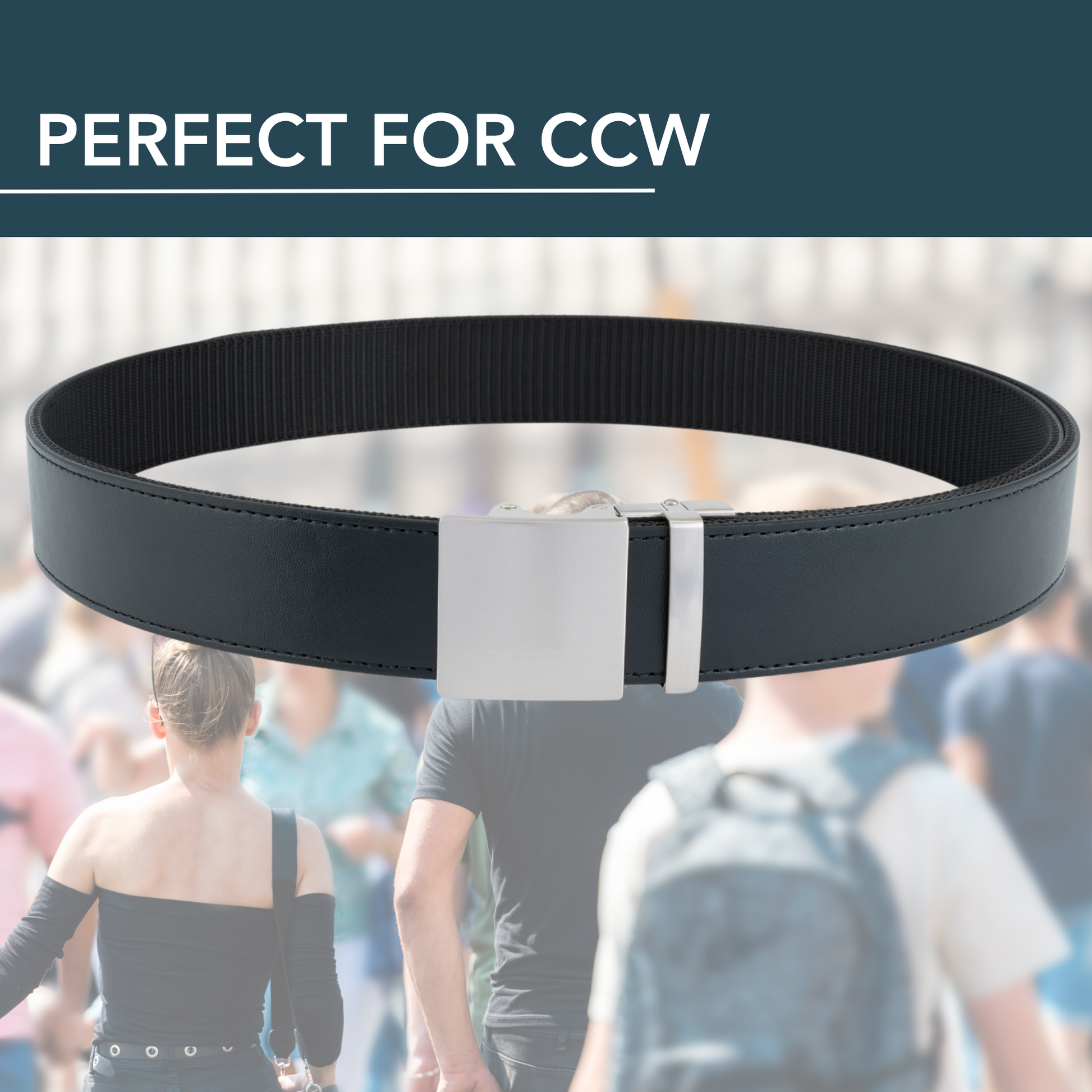 Classic leather meets concealed-carry strength. The Stealth belt combines traditional style with heat-treated ballistic nylon for serious load-bearing power. Ratchet adjustable. Built for life. Trusted by the NRA.