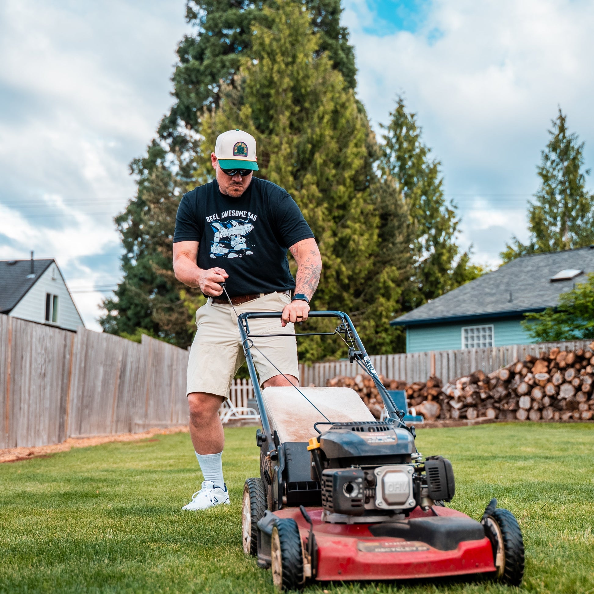 The Reel Awesome dad tee is reporting for yard duty. As soon as the grass is mowed and edged, Dad is headed to the river. Grab your Dad the greatest Father's Day tee of all time!