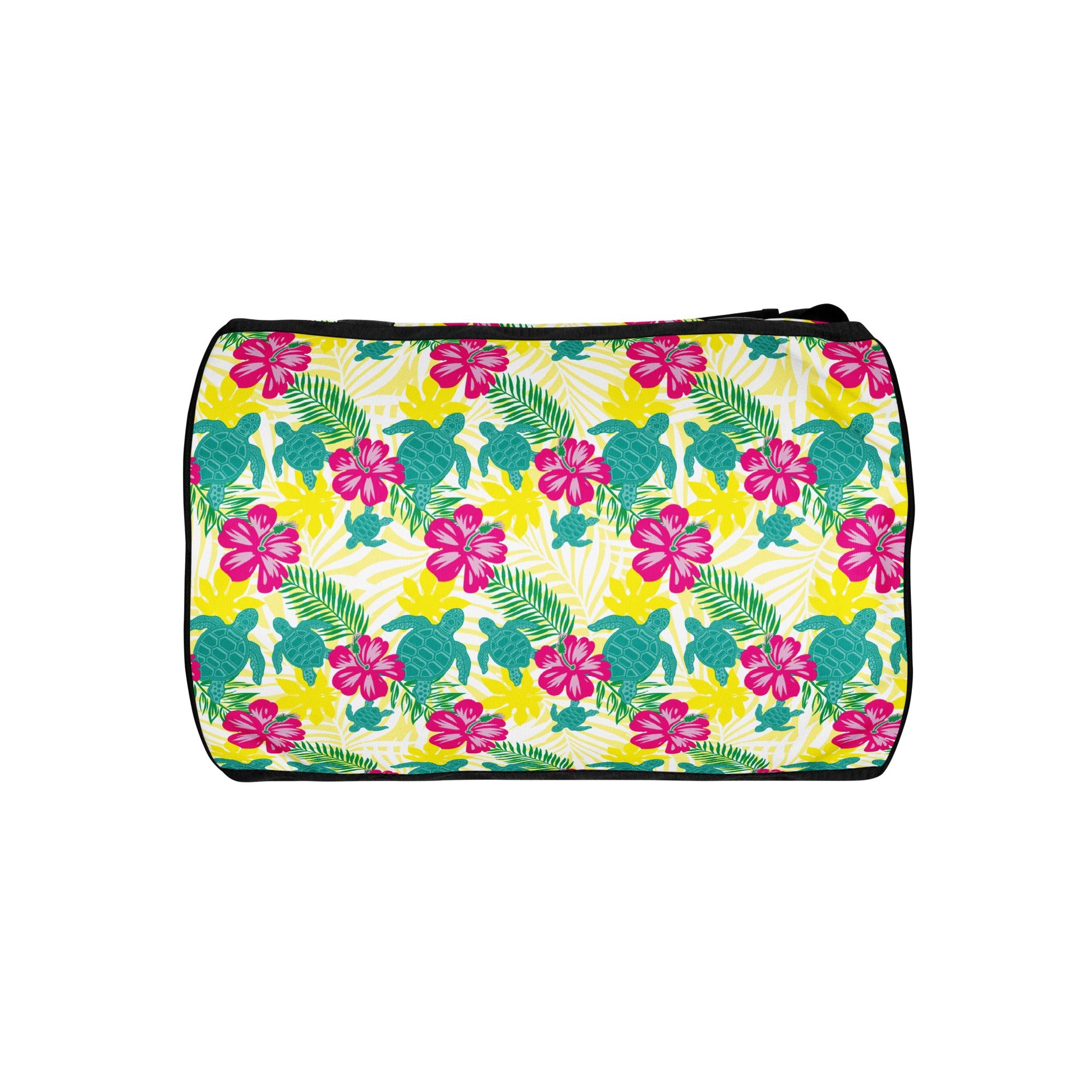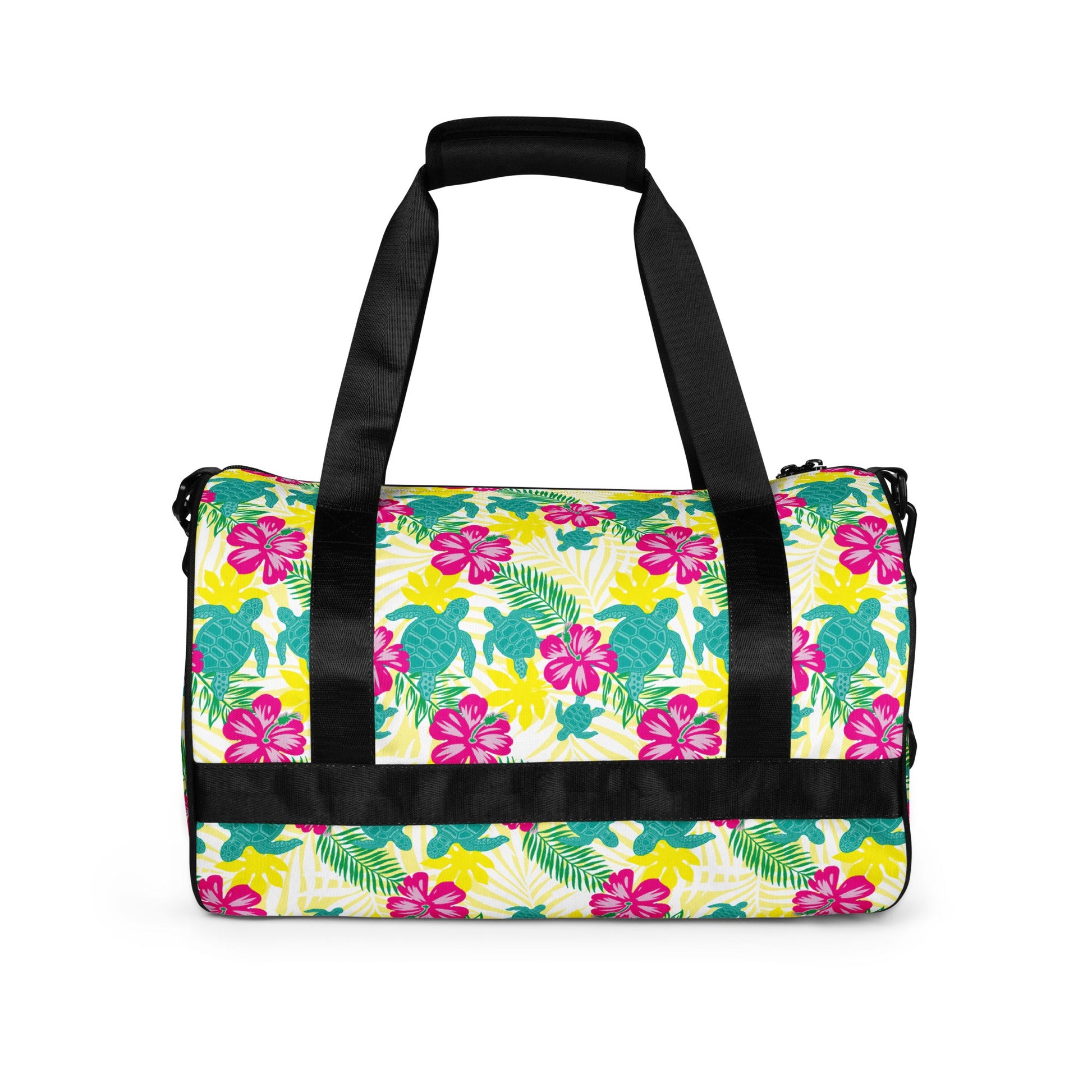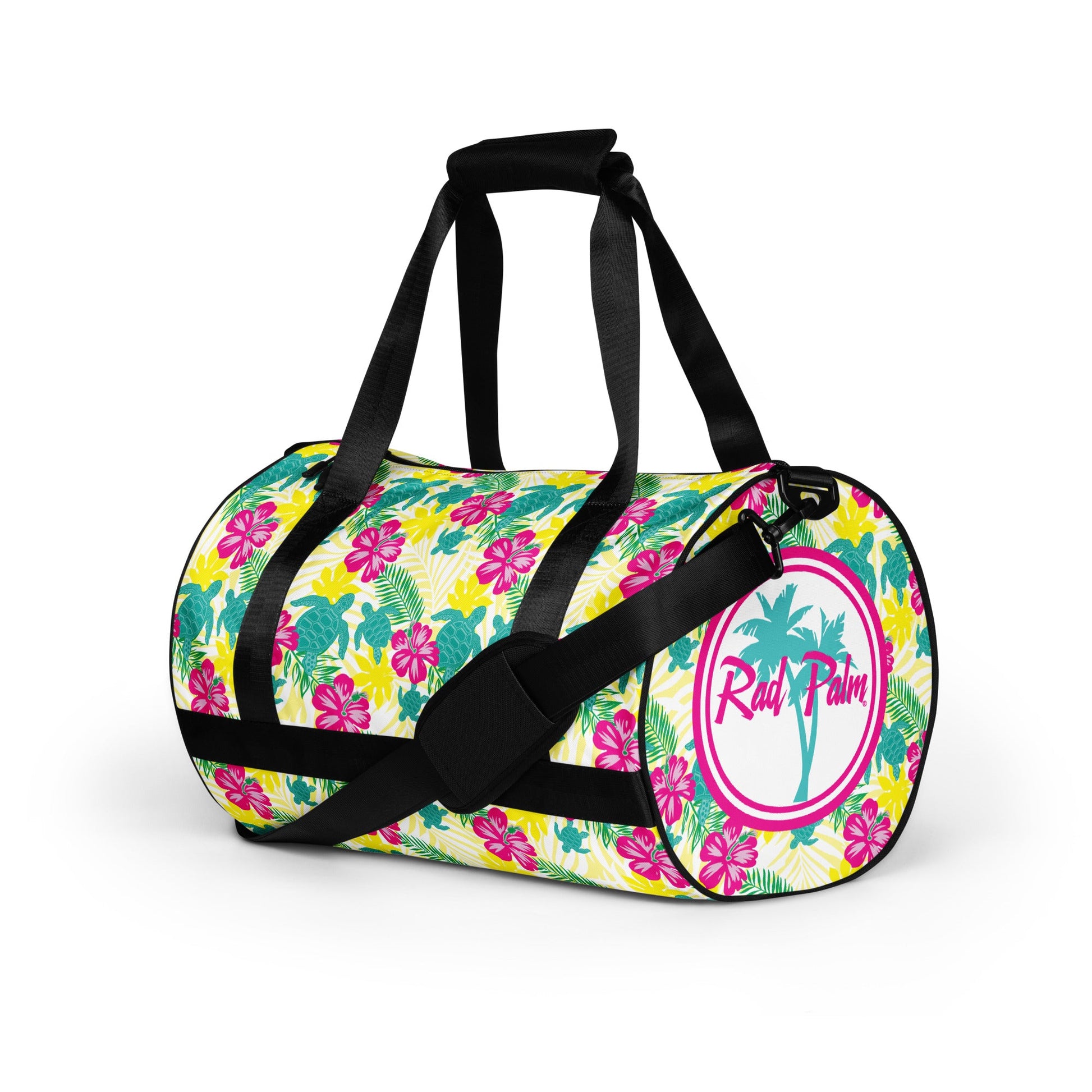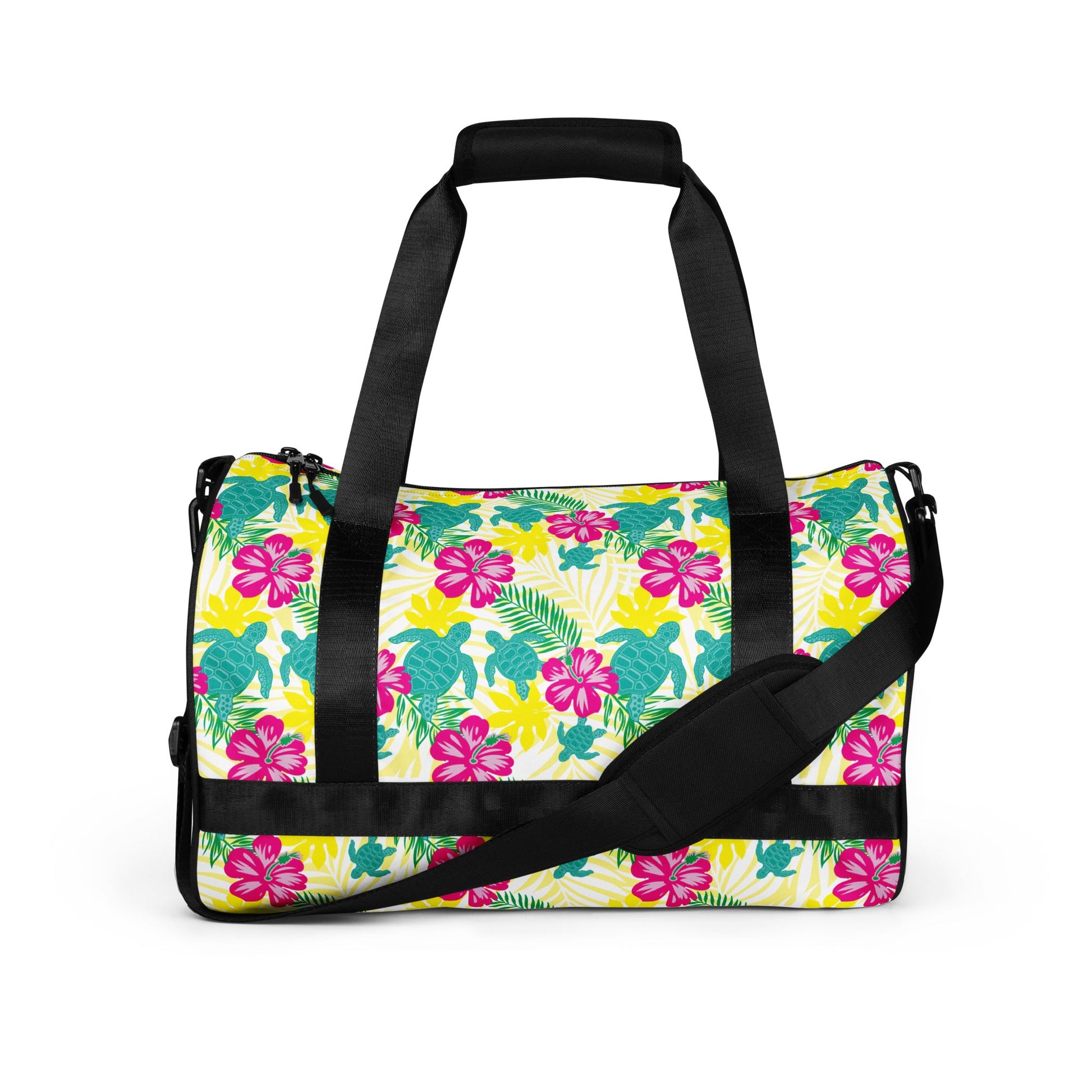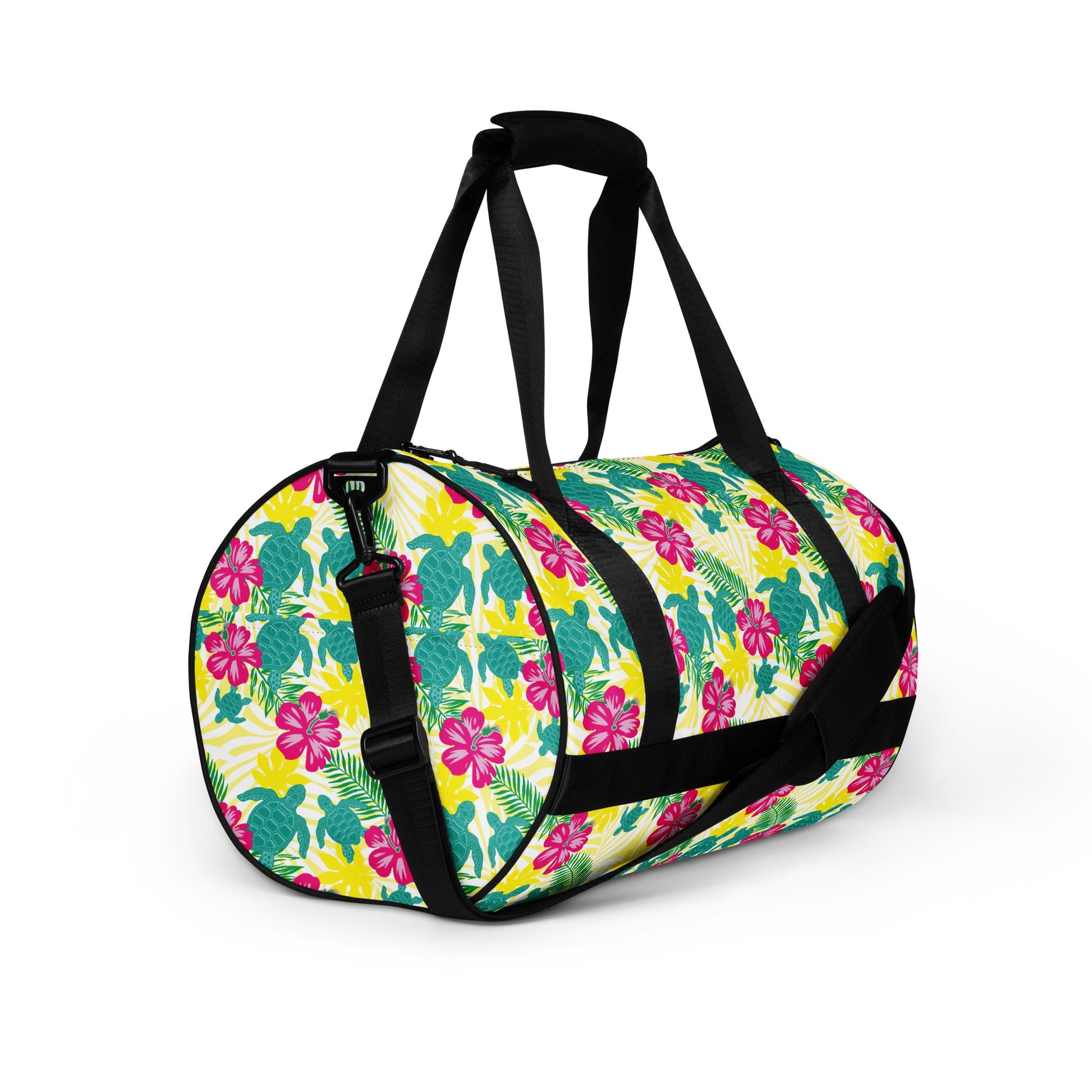 Ready to get your fitness on? Add some punch to pumping iron with this all-over print gym bag. Made from 100% polyester and sturdy, water-resistant fabric, this bag is fun meets function. And it’s got pockets!