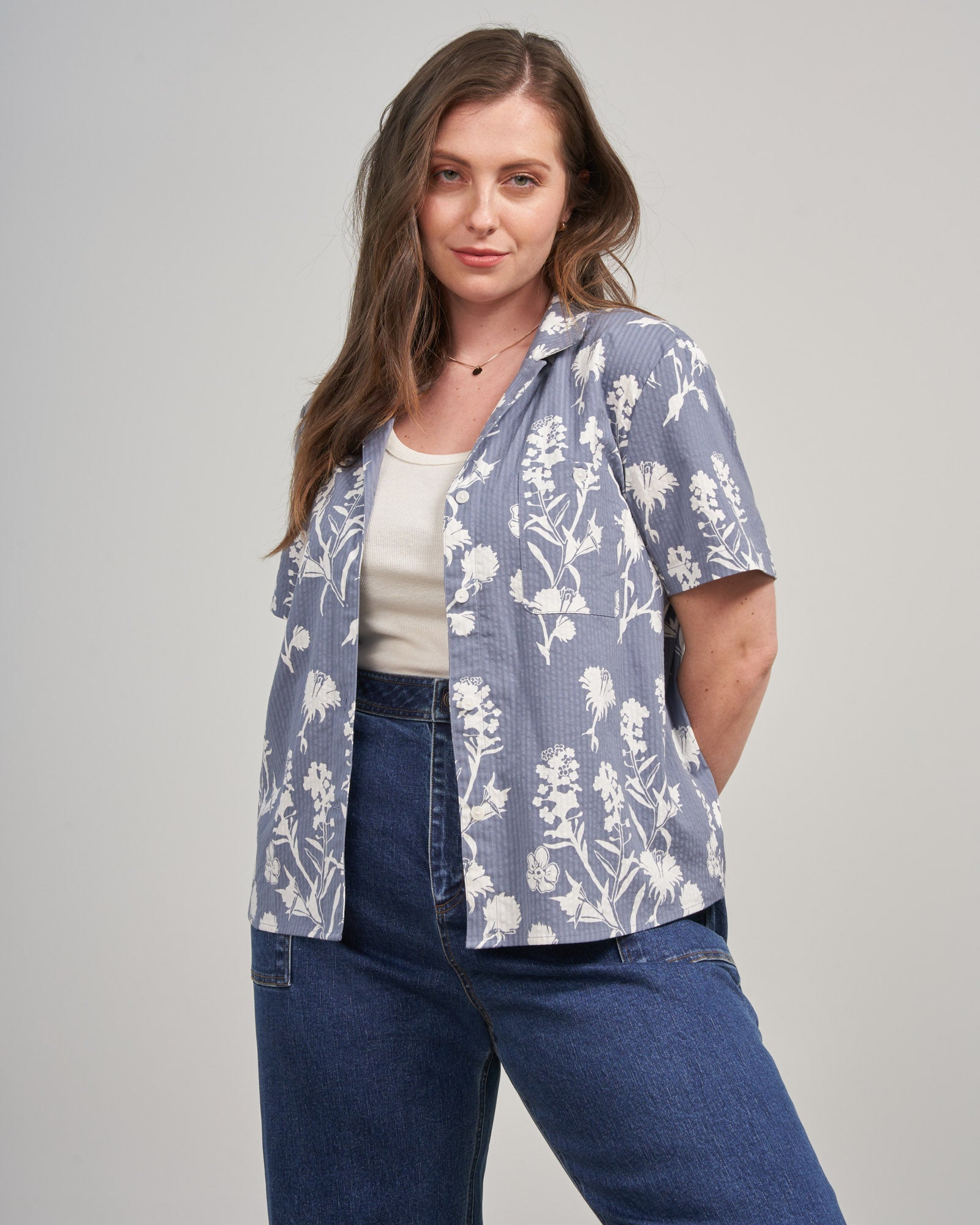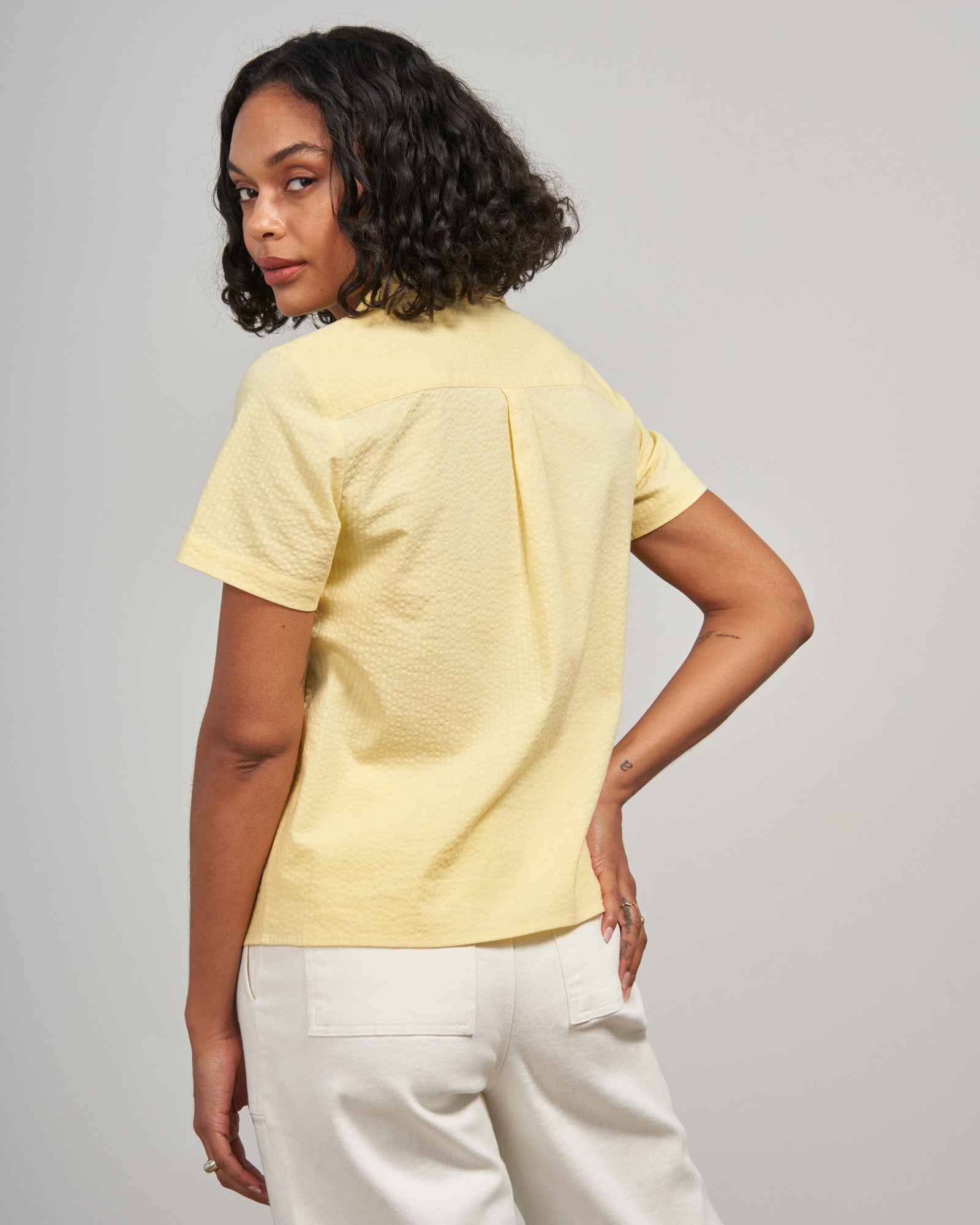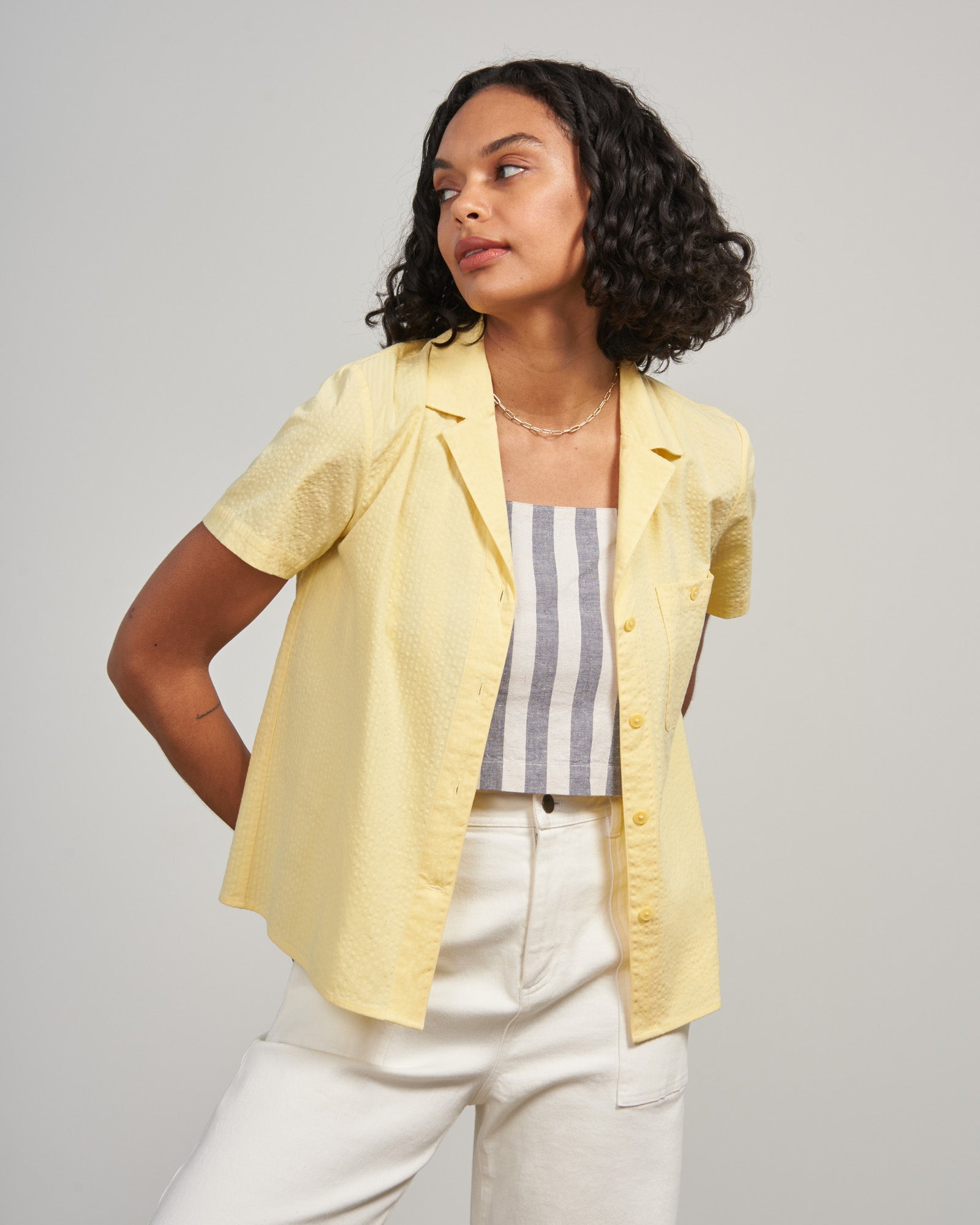 Cool girl summer. Lightweight seersucker fabric gives this easygoing button down a summery, textured look (and is naturally cooling) while a camp collar adds a hint of classic, vintage-inspired style.