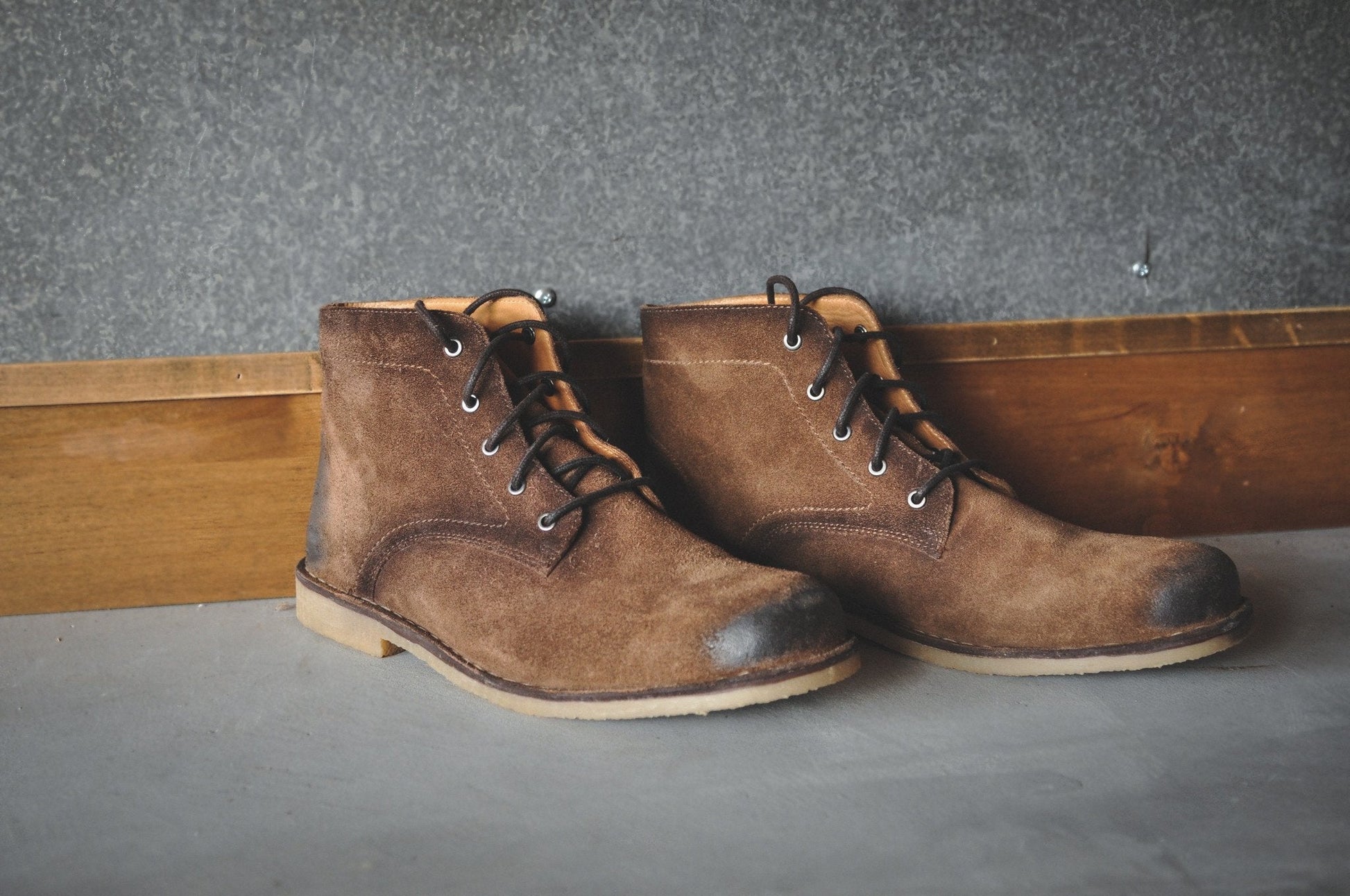 The original “desert boot” was created as a comfortable casual shoe able to survive harsh desert conditions. We think our version works just as well walking downtown streets or propped up on the railing at your favorite watering hole. We made ours just a tad taller than the classic, with 5 eyelets in place of 2 or 3 giving a fresh twist to an old standard. This style features a hand-crafted “stitch-out” construction, that we pair with a TPR (Thermo-Plastic- Rubber) unit outsole- acclaimed for its slip-resistance, flexibility and durability. As a nod to the original we have given the outsole a crepe texture. Besides classic suede (which we also hand-burnish along the edges, toe and heel) we also offer two versions in buffalo leather: black and a daring “oxblood”. The Grover is built on the Rambler last, featuring a strong high-walled toe character that is at once bold and comfortable.