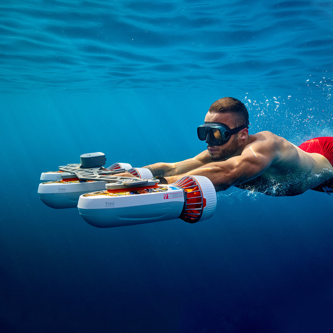 Connect three Tini scooters to create the world’s fastest recreational underwater scooter. The versatile handle locks them together, letting you glide at unmatched speeds while maintaining precise control.