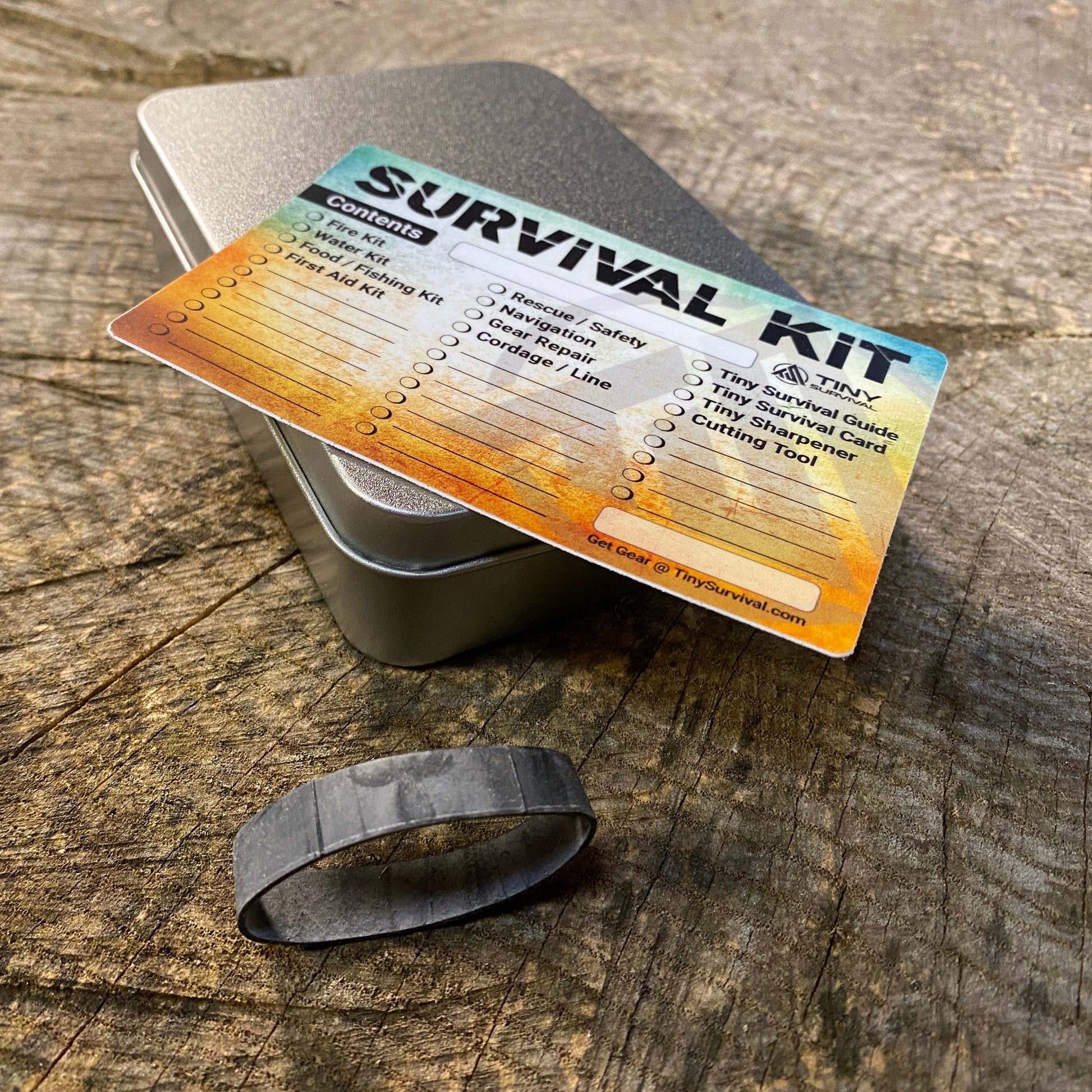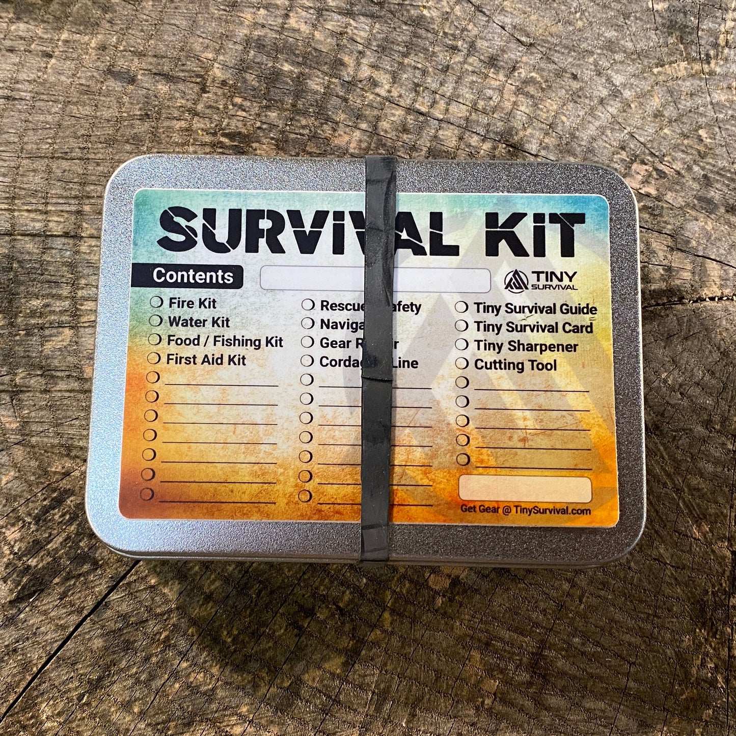 Survival Tin Kit INCLUDES: (1) Large Silver Survival Tin + (1) Ranger Band (to keep tin closed when full - doubles as a fire extender) + (1) Waterproof, Write-On "Survival Kit" Contents Checklist Sticker.