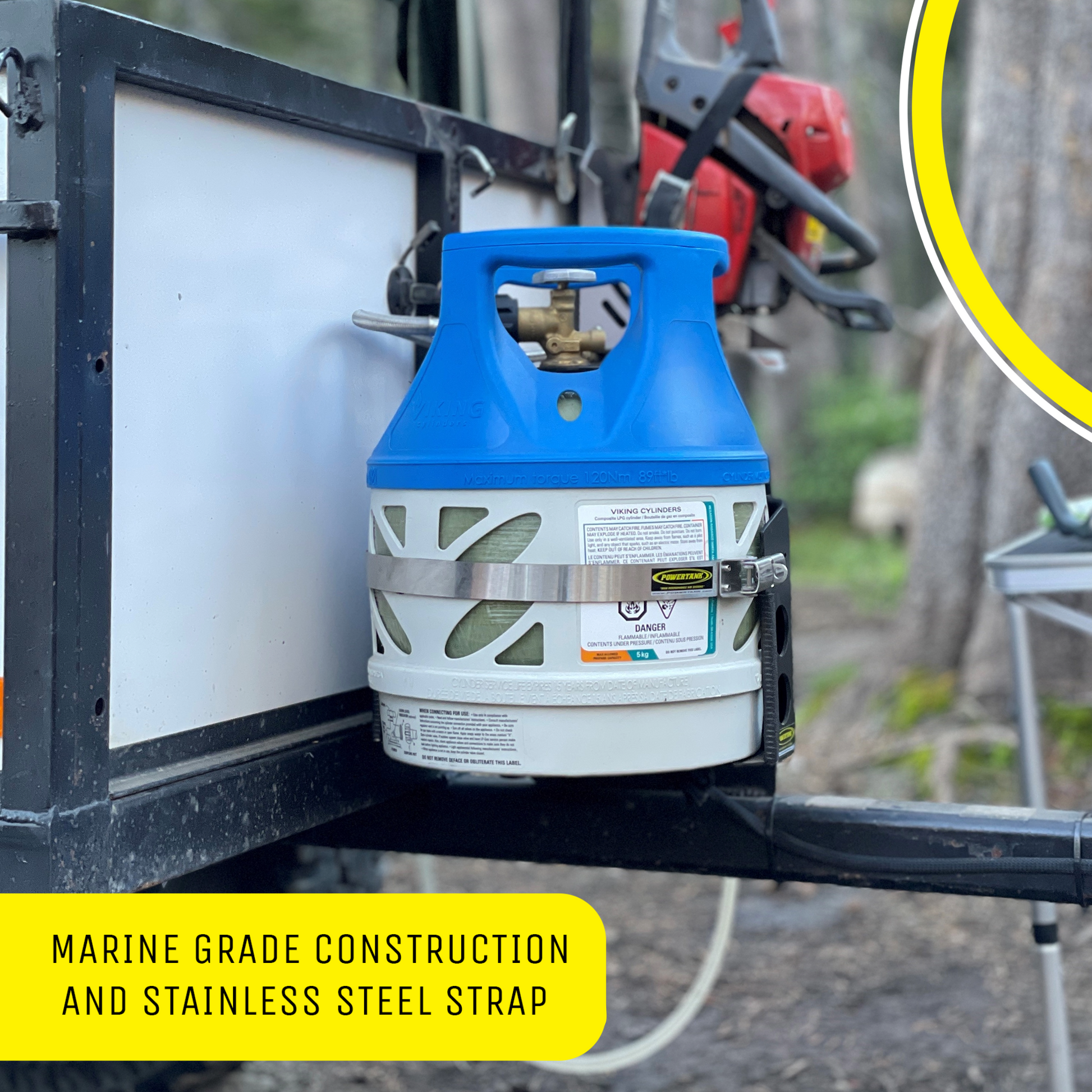 The aluminum frame is powdercoated satin black with rubber trim and bumpers at all major contact areas of the tank. The strap is stainless steel and features an adjustable quick release latch. What's great about this bracket is the latch is reversible can be mounted on either the right or left side using the included removable hardware and the strap can be removed completely when it is not holding a propane tank. The inside of the strap is lined with a rubber padding to protect your tank. The latch does allow a lock to secure your tank from theft.