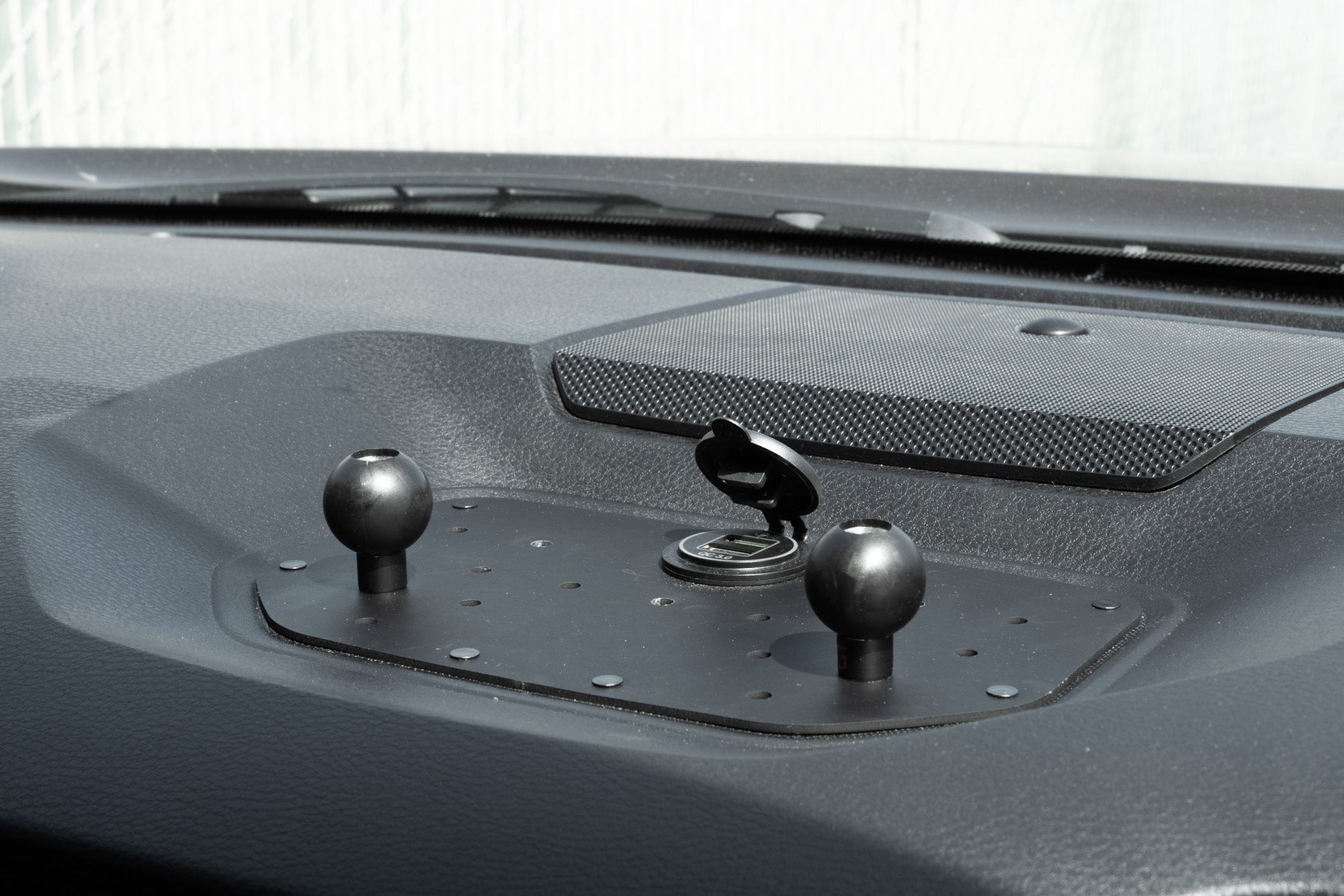 Two plates specifically designed to fit on top and under the dashboard secure the mount to the vehicle and add stiffness to minimize the vibration of mounted accessories.