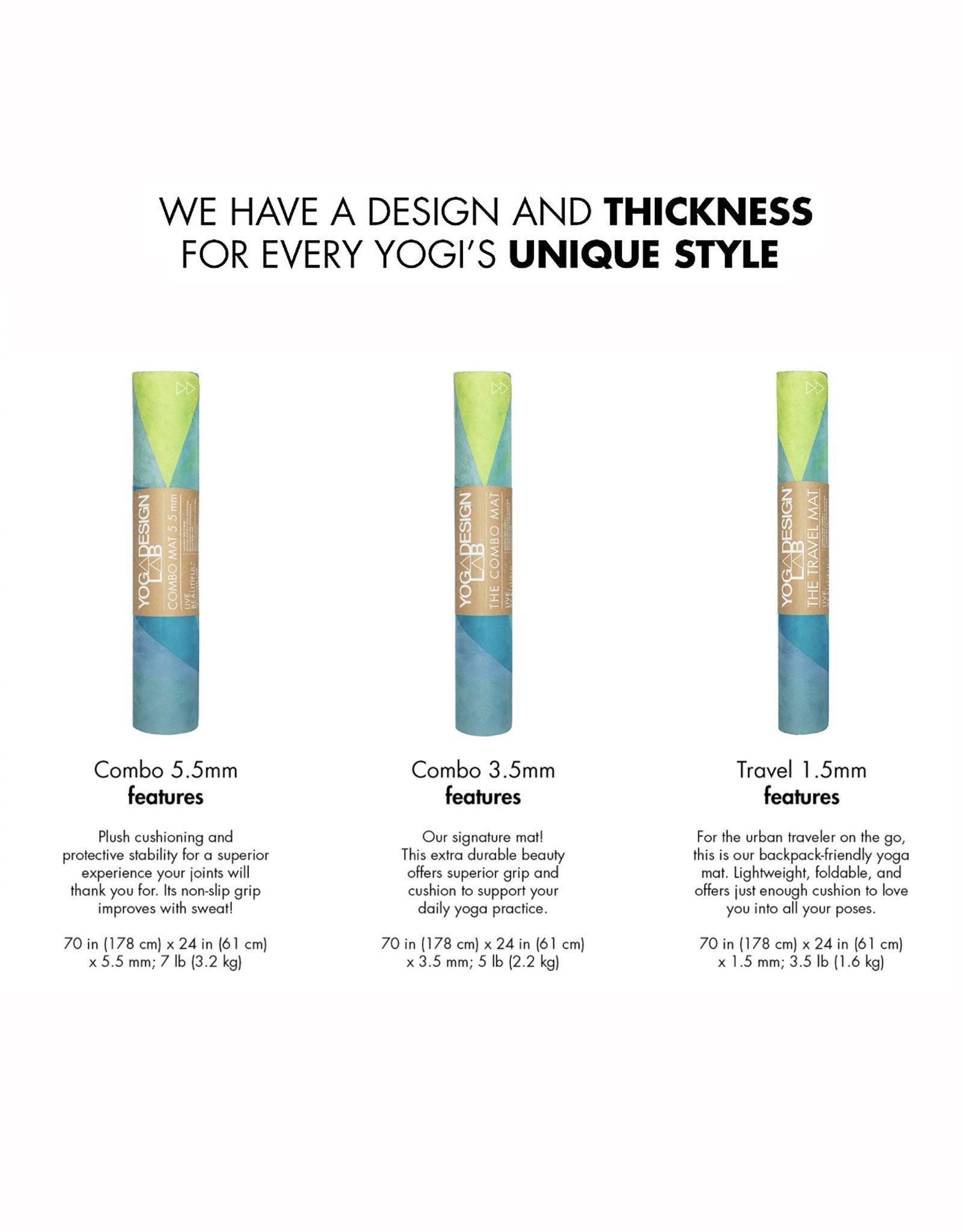 Meet your new travel yoga essential: the Geo Combo Mat from Yoga Design Lab. Designed for yogis on the move, this ultra-lightweight mat combines a luxe, sweat-activated microfiber towel top with a natural rubber base for unbeatable grip and stability - even in the hottest flows. The bold, geometric print energizes your practice while the eco-friendly materials (including recycled plastic bottles and water-based inks) support the planet.
