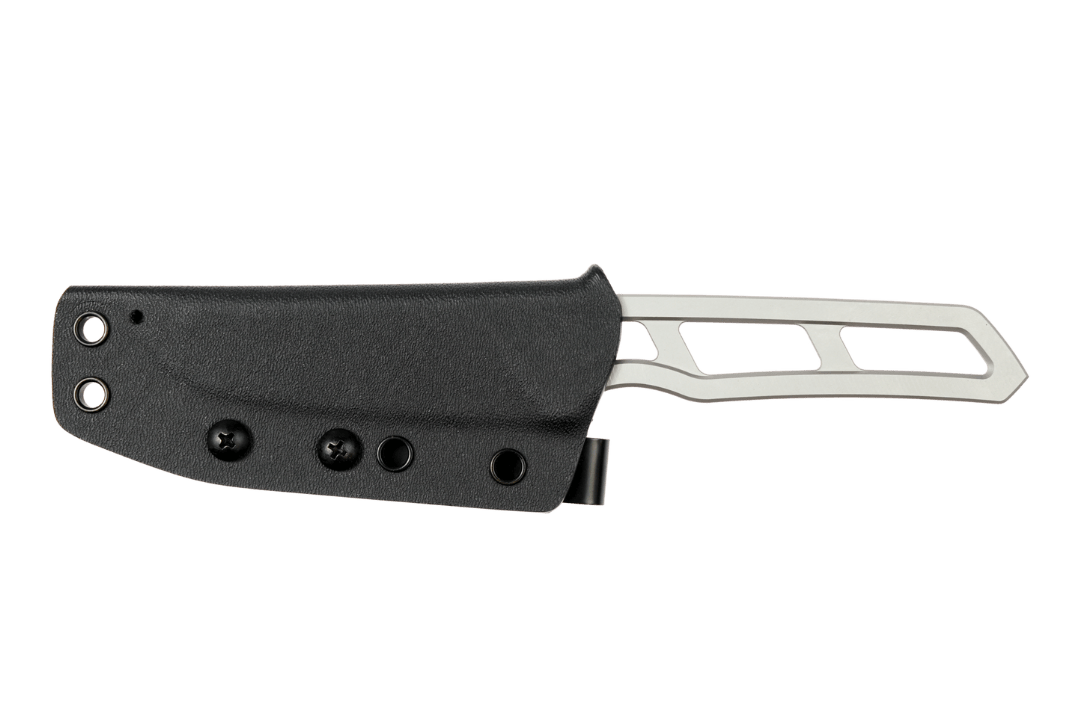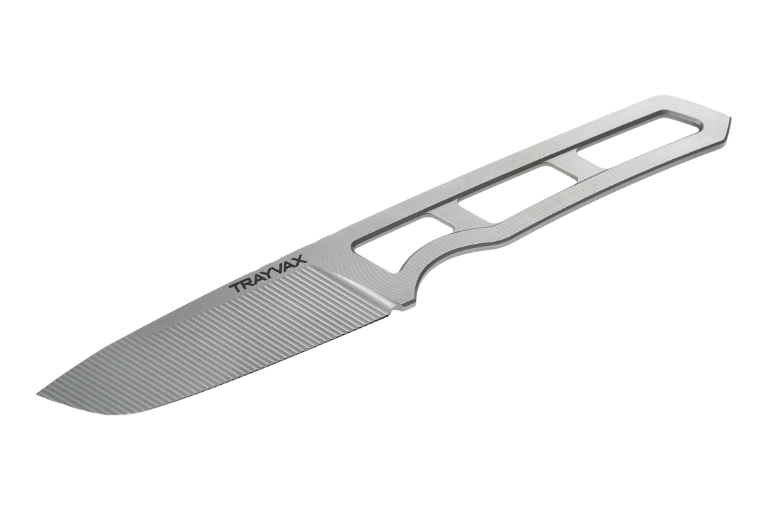 The Trayvax Trek is a USA made CNC machined knife that's simply built to last. The skeletonized frame provides a lightweight design that is easy to clean and maintain. It can easily be wrapped with paracord or handle scales. The blade is perfectly balanced right at the index finger notch, allowing for controlled cutting and a seemingly weightless action.