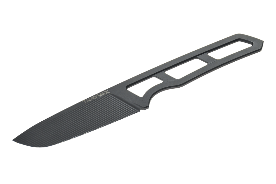 The Trayvax Trek - Black Oxide is a USA made CNC machined knife that's simply built to last. The skeletonized frame provides a lightweight design that is easy to clean and maintain. It can easily be wrapped with paracord or handle scales. The blade is perfectly balanced right at the index finger notch, allowing for controlled cutting and a seemingly weightless action.