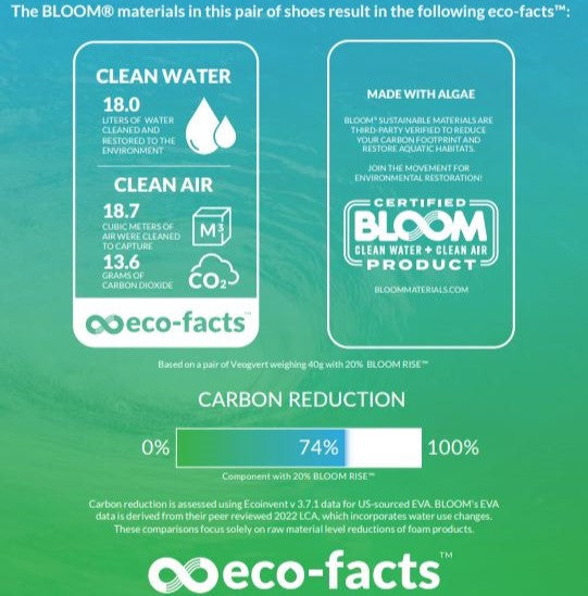 BLOOM® FOAM EVA - this item features Bloom®, developed through a sustainable manufacturing process that integrates algae biomass. This innovative process decreases our dependence on conventional fossil fuels, lessening our carbon footprint and petroleum use while helping restore ecosystems. Bloom® foam delivers outstanding shock absorption and support. It also has moisture-wicking properties to keep your feet dry and odour-resistant qualities for long-lasting freshness.