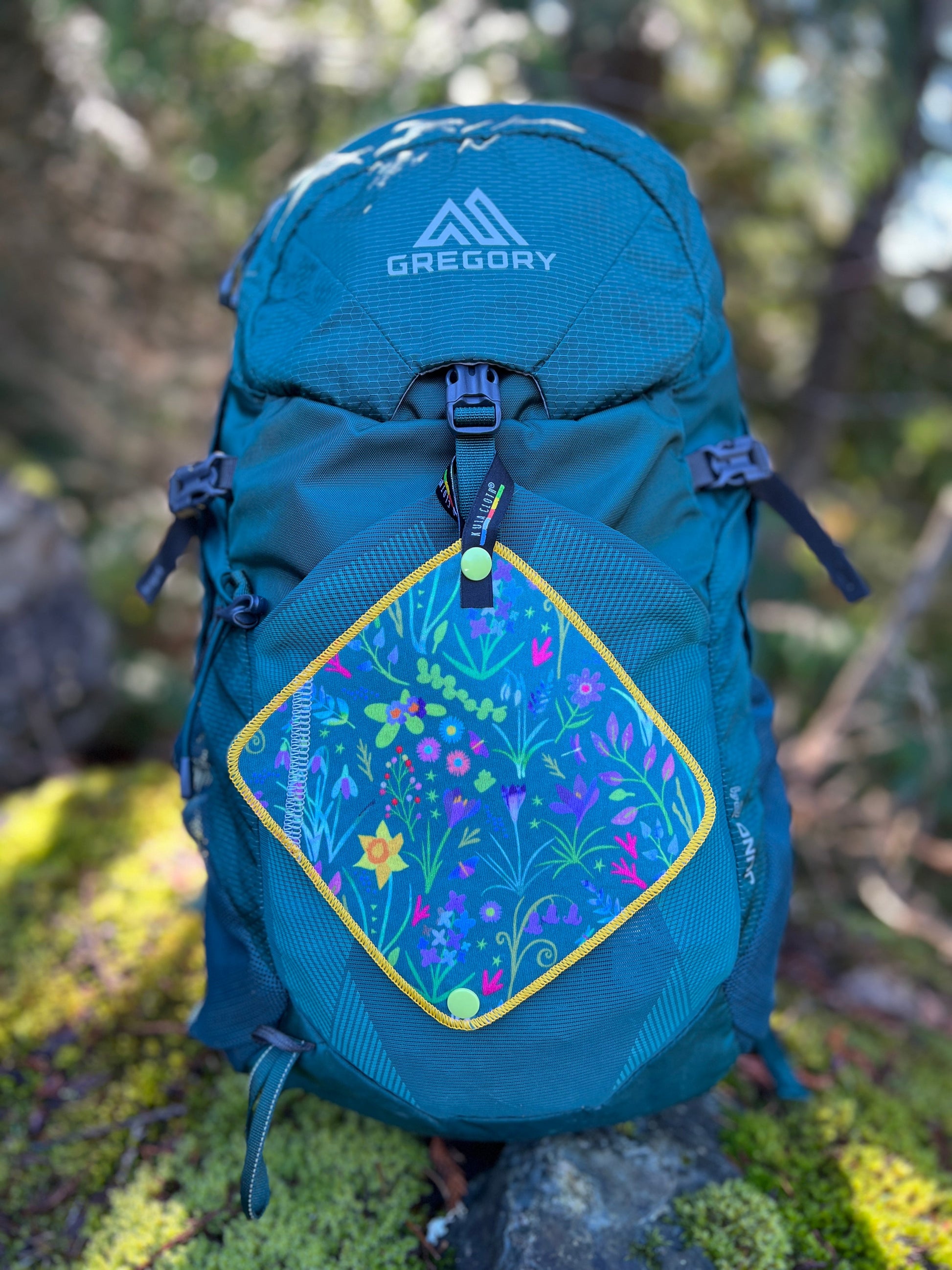 - 'double snap' allows cloth to hang while folded in half (so it doesn't touch pack and/or get dirty on the trail)