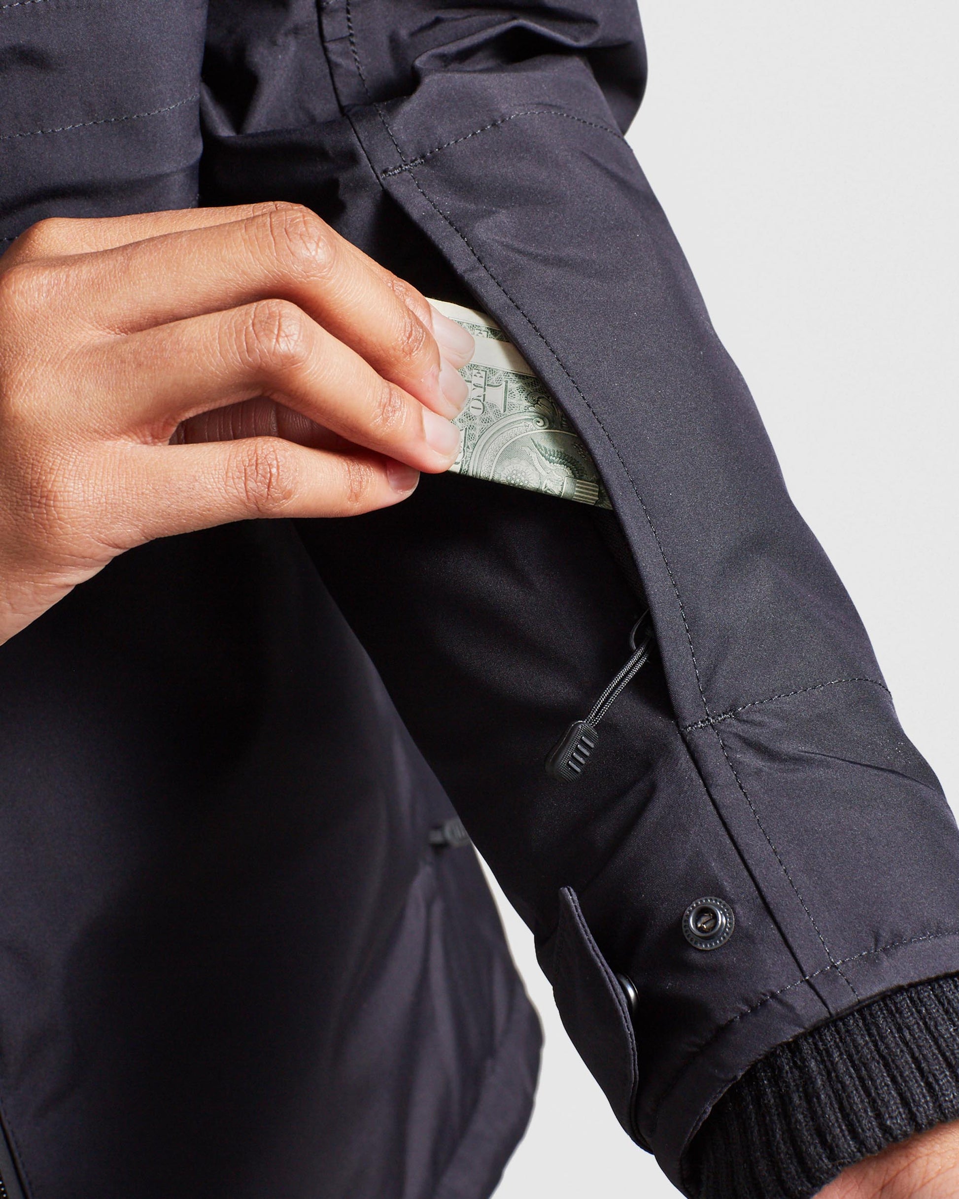 - Two chest pockets, two side pockets, two interior pockets, stash pocket on sleeve for lift tickets or subway passes
