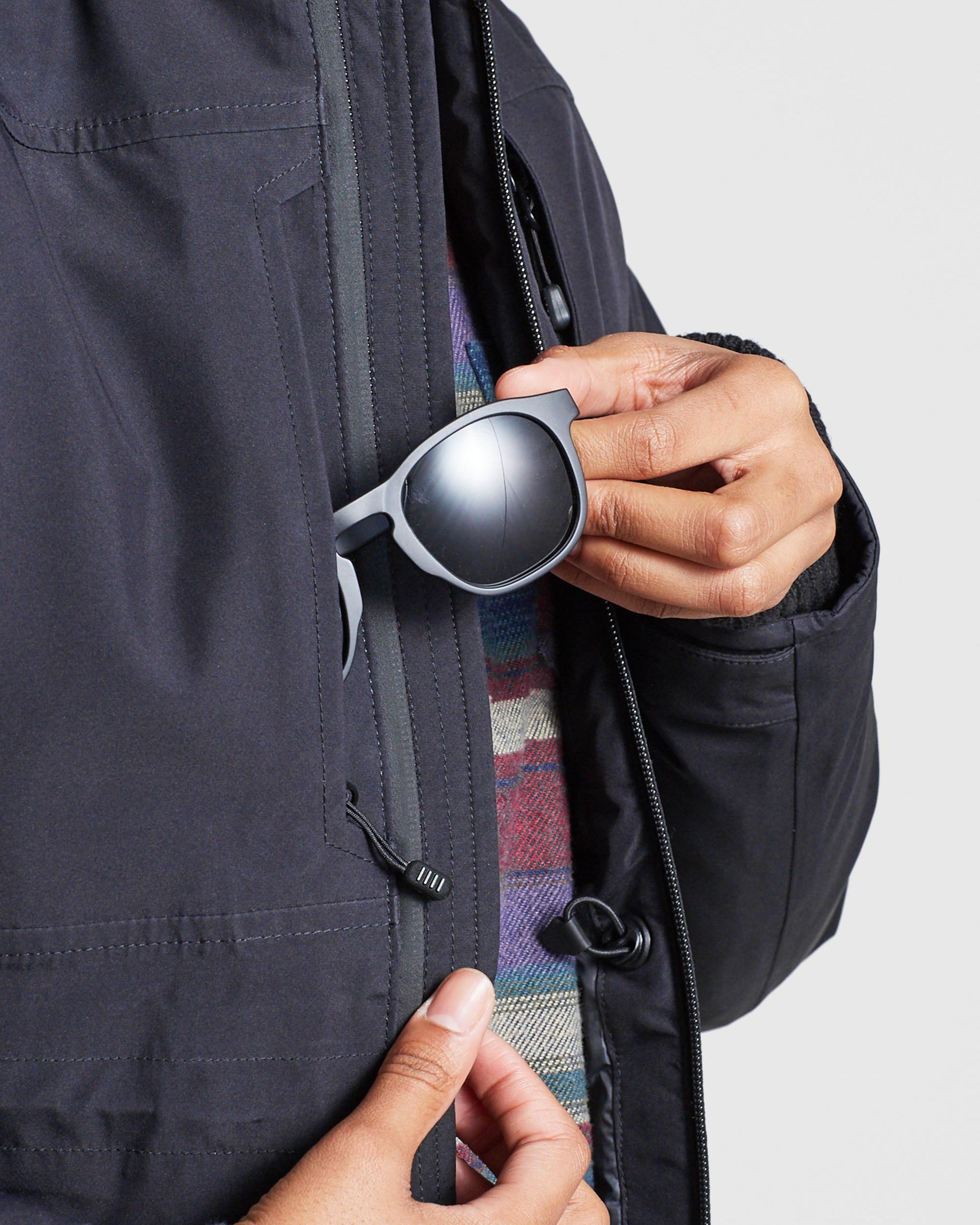 - Anchored drawcord at hem to adjust fit, with a no-moving-part cord lock to withstand wear and tear and articulated, adjustable sleeves with anchored drawcords.
