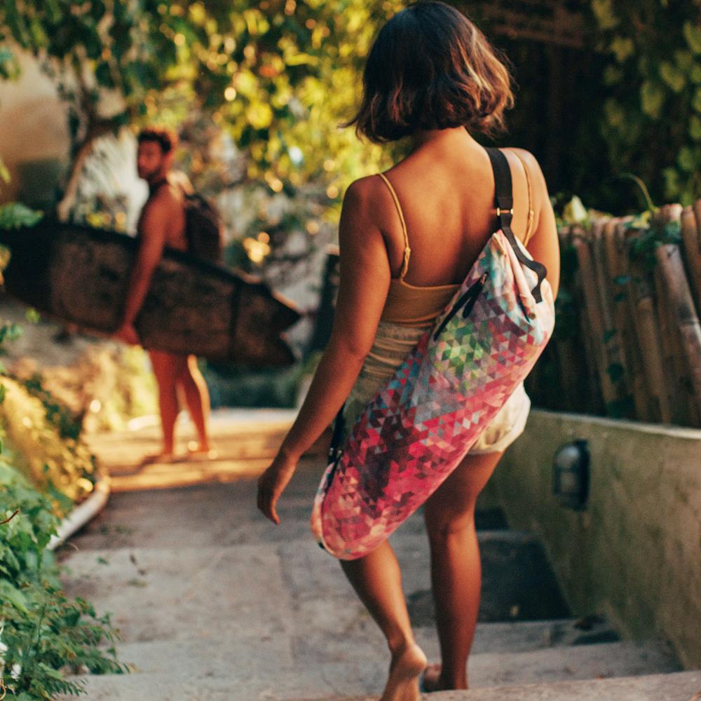 This versatile yoga mat bag features an adjustable strap, extra pockets, and room to store mat and some extras. Vibrant, soft microfiber is comfortable to carry.